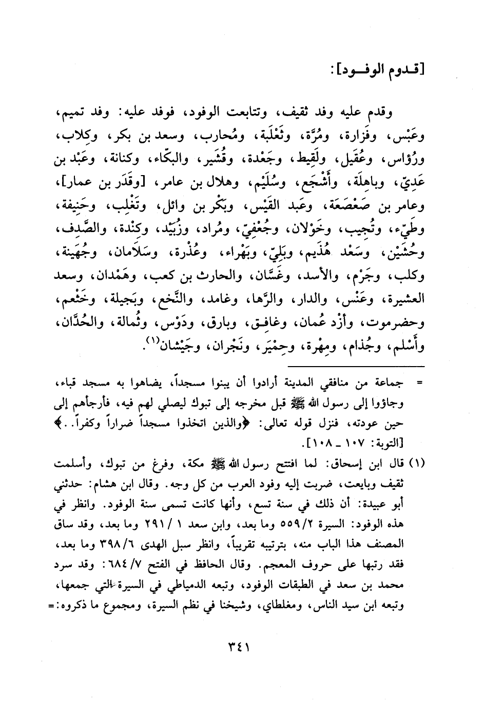 (¬1) قال ابن إسحاق: لما افتتح رسول الله صلى الله عليه وسلم مكة، وفرغ من تبوك، وأسلمت ثقيف وبايعت، ضربت إليه وفود العرب من كل وجه. وقال ابن هشام: حدثني أبو عبيدة: أن ذلك في سنة تسع، وأنها كانت تسمى سنة الوفود. وانظر في هذه الوفود: السيرة 2/ 559 وما بعد، وابن سعد 1/ 291 وما بعد، وقد ساق المصنف هذا الباب منه، بترتيبه تقريبا، وانظر سبل الهدى 6/ 398 وما بعد، فقد رتبها على حروف المعجم. وقال الحافظ في الفتح 7/ 684: وقد سرد محمد بن سعد في الطبقات الوفود، وتبعه الدمياطي في السيرة التي جمعها، وتبعه ابن سيد الناس، ومغلطاي، وشيخنا في نظم السيرة، ومجموع ما ذكروه: =