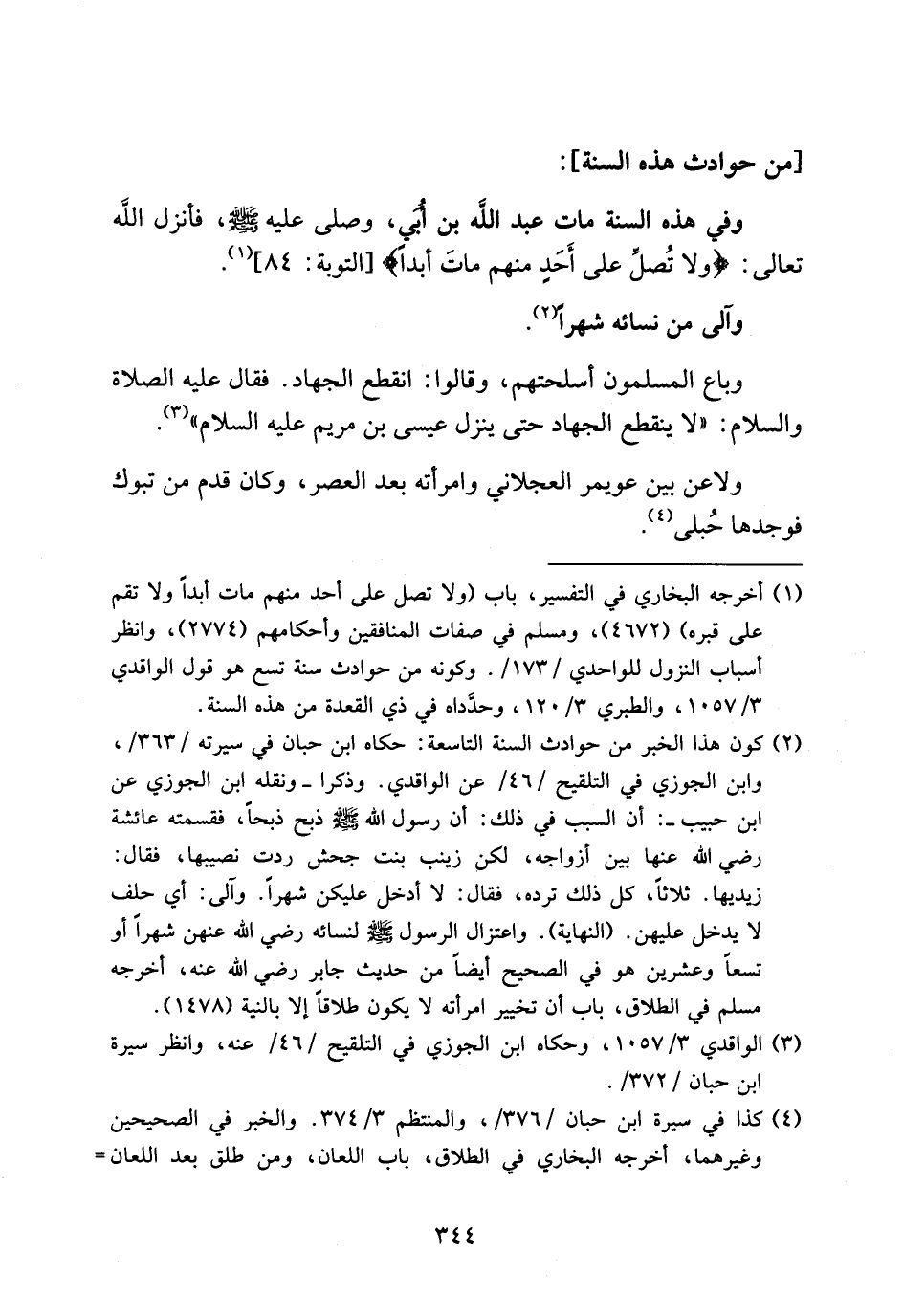 (¬1) أخرجه البخاري في التفسير، باب (ولا تصل على أحد منهم مات أبدا ولا تقم على قبره) (4672)، ومسلم في صفات المنافقين وأحكامهم (2774)، وانظر أسباب النزول للواحدي/173/. وكونه من حوادث سنة تسع هو قول الواقدي 3/ 1057، والطبري 3/ 120، وحدّداه في ذي القعدة من هذه السنة.