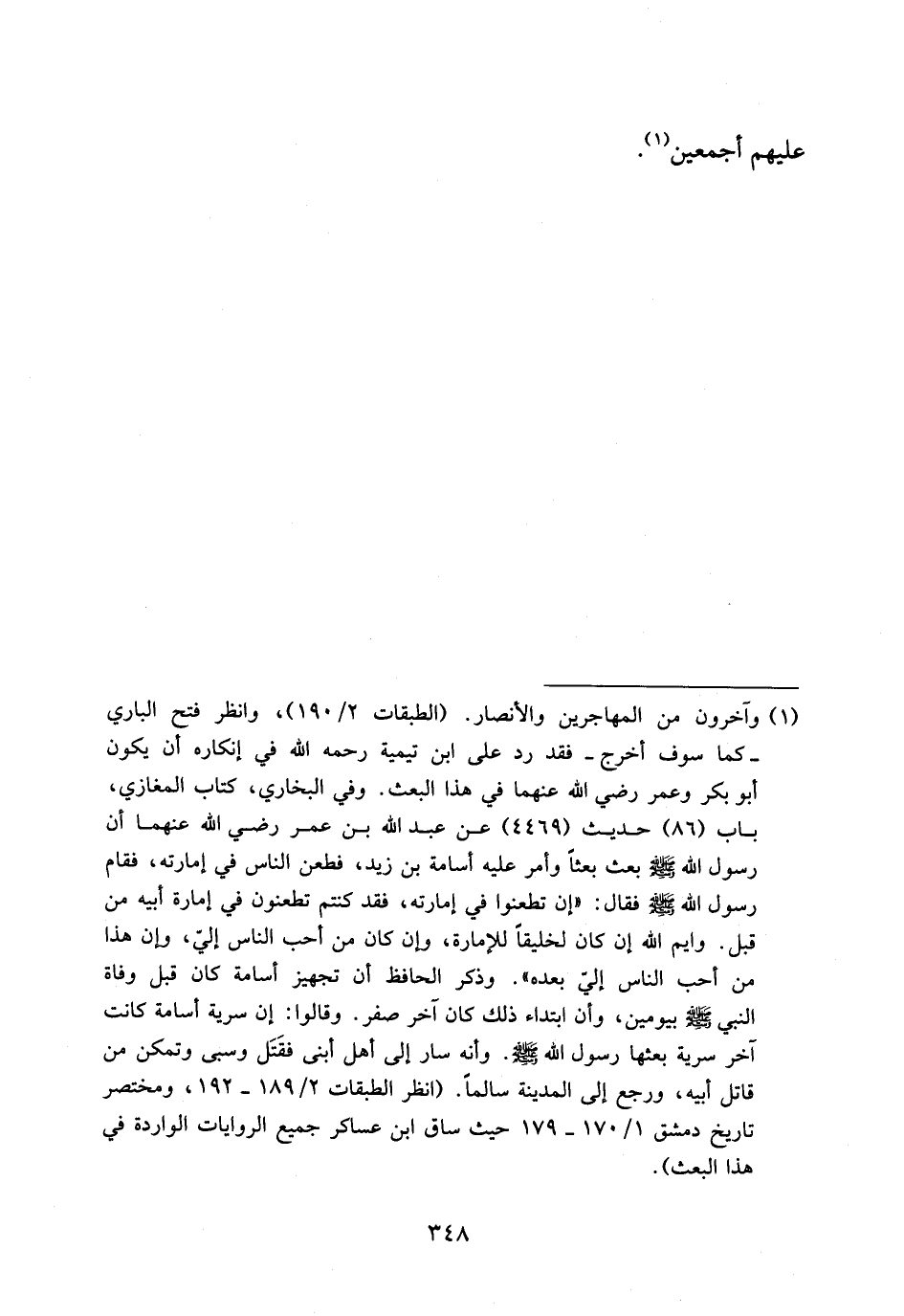 (¬1) وآخرون من المهاجرين والأنصار. (الطبقات 2/ 190)، وانظر فتح الباري -كما سوف أخرج-فقد رد على ابن تيمية رحمه الله في إنكاره أن يكون أبو بكر وعمر رضي الله عنهما في هذا البعث. وفي البخاري، كتاب المغازي، باب (86) حديث (4469) عن عبد الله بن عمر رضي الله عنهما أن رسول الله صلى الله عليه وسلم بعث بعثا وأمر عليه أسامة بن زيد، فطعن الناس في إمارته، فقام رسول الله صلى الله عليه وسلم فقال: «إن تطعنوا في إمارته، فقد كنتم تطعنون في إمارة أبيه من قبل. وايم الله إن كان لخليقا للإمارة، وإن كان من أحب الناس إليّ، وإن هذا من أحب الناس إليّ بعده». وذكر الحافظ أن تجهيز أسامة كان قبل وفاة النبي صلى الله عليه وسلم بيومين، وأن ابتداء ذلك كان آخر صفر. وقالوا: إن سرية أسامة كانت آخر سرية بعثها رسول الله صلى الله عليه وسلم. وأنه سار إلى أهل أبنى فقتل وسبى وتمكن من قاتل أبيه، ورجع إلى المدينة سالما. (انظر الطبقات 2/ 189 - 192، ومختصر تاريخ دمشق 1/ 170 - 179 حيث ساق ابن عساكر جميع الروايات الواردة في هذا البعث).