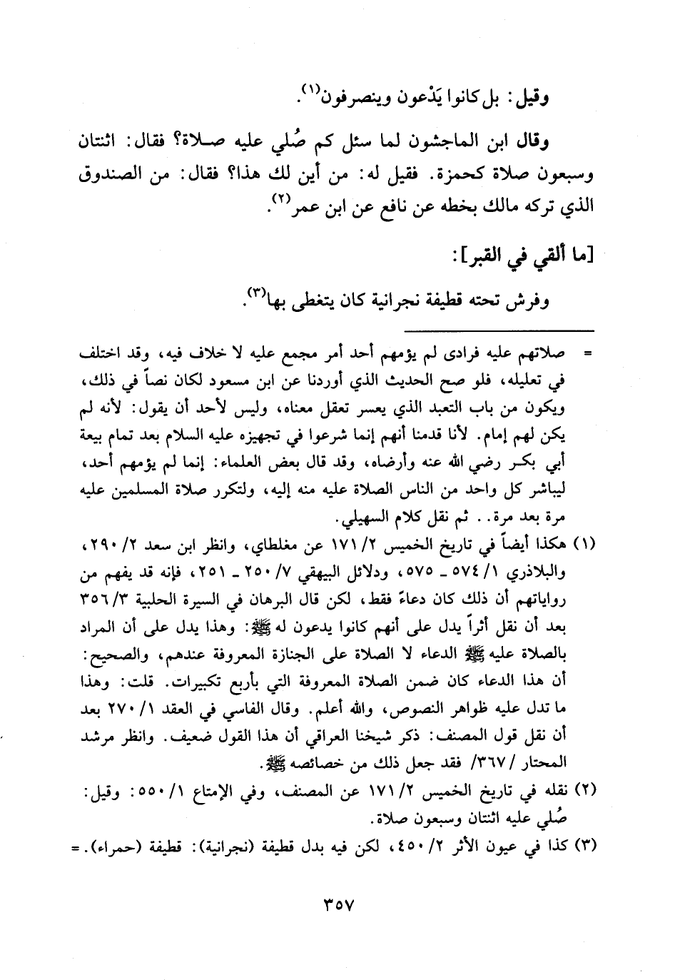 (¬1) هكذا أيضا في تاريخ الخميس 2/ 171 عن مغلطاي، وانظر ابن سعد 2/ 290، والبلاذري 1/ 574 - 575، ودلائل البيهقي 7/ 250 - 251، فإنه قد يفهم من رواياتهم أن ذلك كان دعاء فقط، لكن قال البرهان في السيرة الحلبية 3/ 356 بعد أن نقل أثرا يدل على أنهم كانوا يدعون له صلى الله عليه وسلم: وهذا يدل على أن المراد بالصلاة عليه صلى الله عليه وسلم الدعاء لا الصلاة على الجنازة المعروفة عندهم، والصحيح: أن هذا الدعاء كان ضمن الصلاة المعروفة التي بأربع تكبيرات. قلت: وهذا ما تدل عليه ظواهر النصوص، والله أعلم. وقال الفاسي في العقد 1/ 270 بعد أن نقل قول المصنف: ذكر شيخنا العراقي أن هذا القول ضعيف. وانظر مرشد المحتار/367/فقد جعل ذلك من خصائصه صلى الله عليه وسلم.