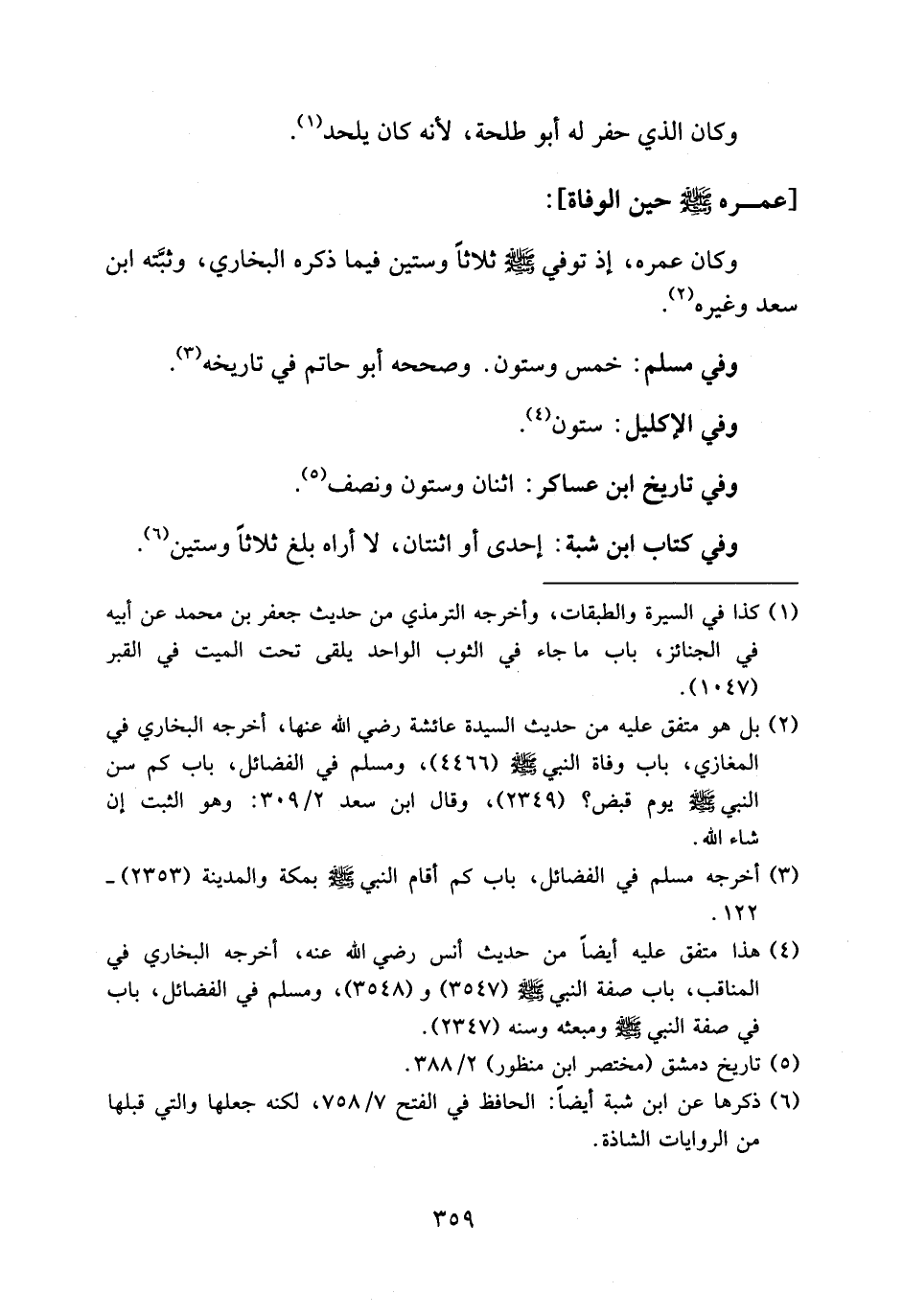 (¬2) بل هو متفق عليه من حديث السيدة عائشة رضي الله عنها، أخرجه البخاري في المغازي، باب وفاة النبي صلى الله عليه وسلم (4466)، ومسلم في الفضائل، باب كم سن النبي صلى الله عليه وسلم يوم قبض؟ (2349)، وقال ابن سعد 2/ 309: وهو الثبت إن شاء الله.
