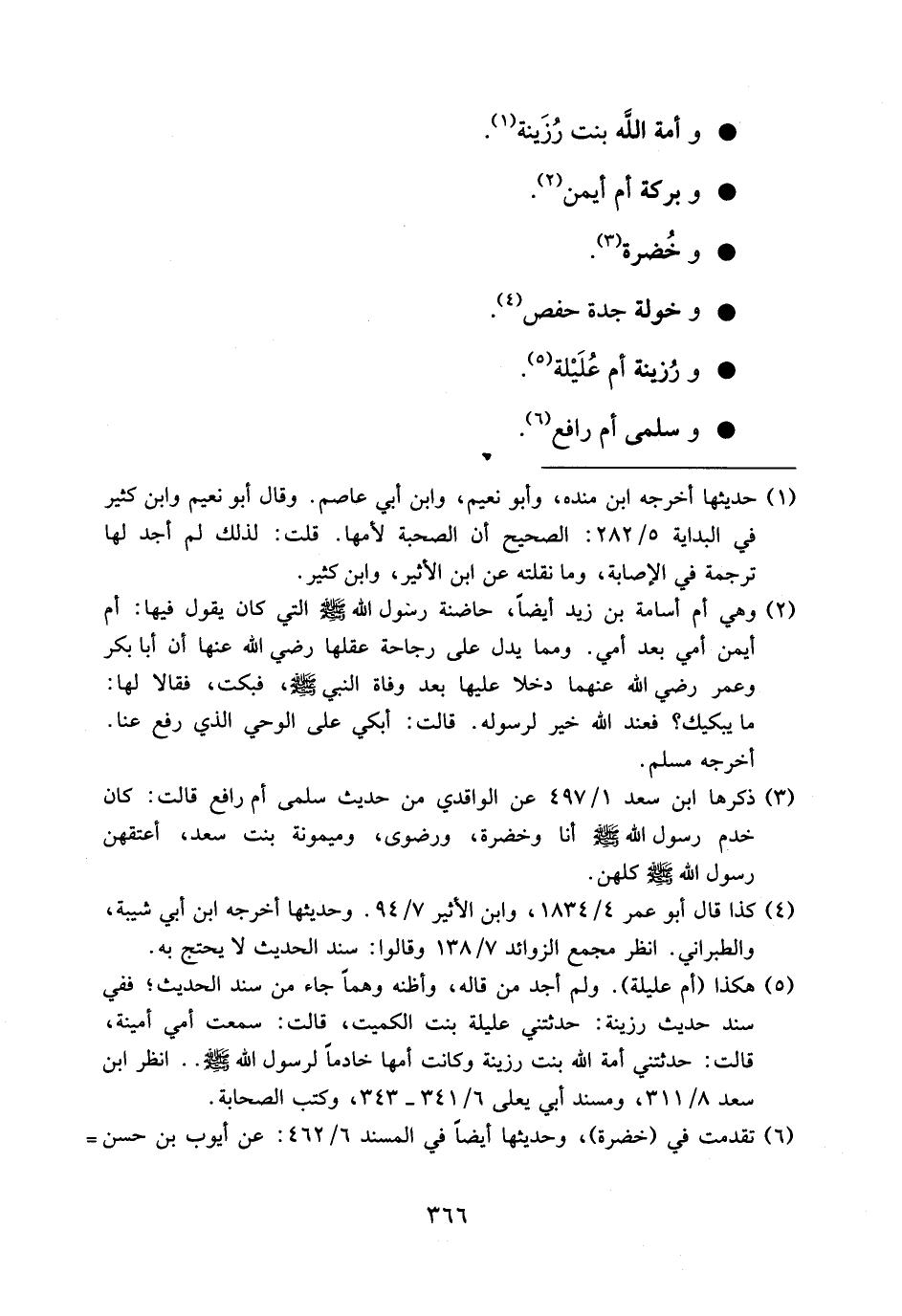 (¬2) وهي أم أسامة بن زيد أيضا، حاضنة رسول الله صلى الله عليه وسلم التي كان يقول فيها: أم أيمن أمي بعد أمي. ومما يدل على رجاحة عقلها رضي الله عنها أن أبا بكر وعمر رضي الله عنهما دخلا عليها بعد وفاة النبي صلى الله عليه وسلم، فبكت، فقالا لها: ما يبكيك؟ فعند الله خير لرسوله. قالت: أبكي على الوحي الذي رفع عنا. أخرجه مسلم.