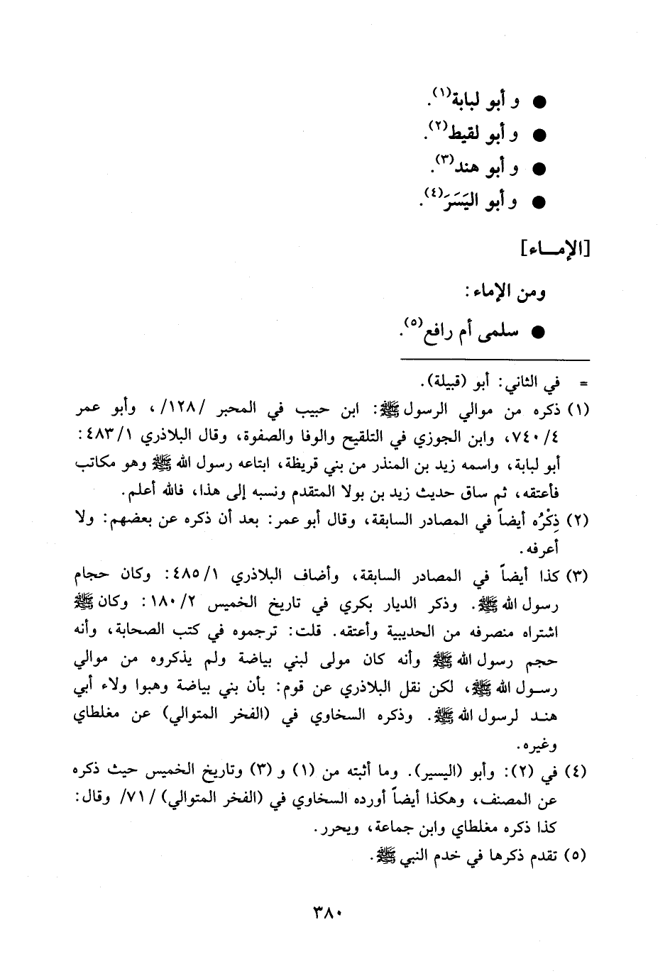(¬3) كذا أيضا في المصادر السابقة، وأضاف البلاذري 1/ 485: وكان حجام رسول الله صلى الله عليه وسلم. وذكر الديار بكري في تاريخ الخميس 2/ 180: وكان صلى الله عليه وسلم اشتراه منصرفه من الحديبية وأعتقه. قلت: ترجموه في كتب الصحابة، وأنه حجم رسول الله صلى الله عليه وسلم وأنه كان مولى لبني بياضة ولم يذكروه من موالي رسول الله صلى الله عليه وسلم، لكن نقل البلاذري عن قوم: بأن بني بياضة وهبوا ولاء أبي هند لرسول الله صلى الله عليه وسلم. وذكره السخاوي في (الفخر المتوالي) عن مغلطاي وغيره.