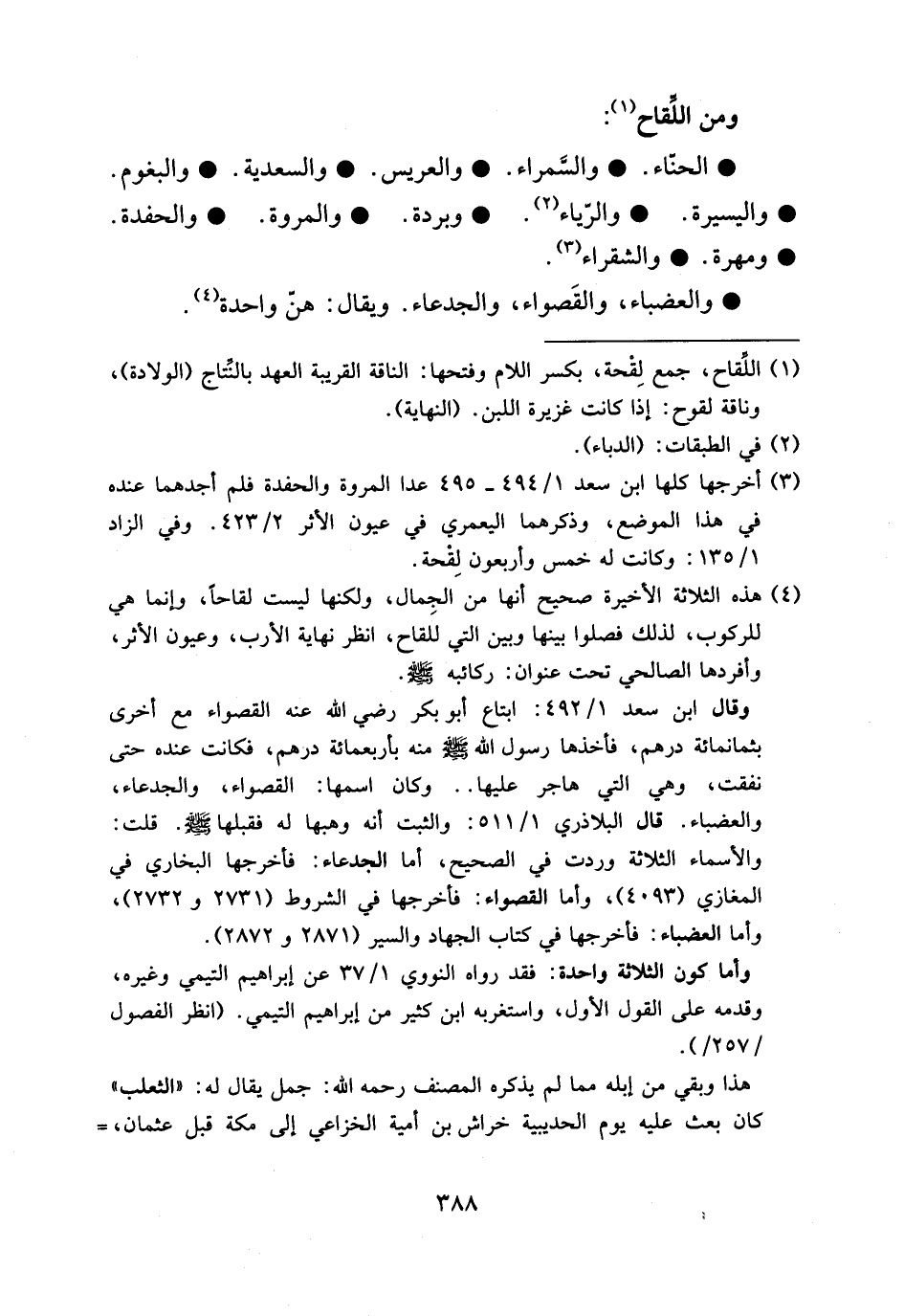 (¬4) هذه الثلاثة الأخيرة صحيح أنها من الجمال، ولكنها ليست لقاحا، وإنما هي للركوب، لذلك فصلوا بينها وبين التي للقاح، انظر نهاية الأرب، وعيون الأثر، وأفردها الصالحي تحت عنوان: ركائبه صلى الله عليه وسلم. وقال ابن سعد 1/ 492: ابتاع أبو بكر رضي الله عنه القصواء مع أخرى بثمانمائة درهم، فأخذها رسول الله صلى الله عليه وسلم منه بأربعمائة درهم، فكانت عنده حتى نفقت، وهي التي هاجر عليها. . وكان اسمها: القصواء، والجدعاء، والعضباء. قال البلاذري 1/ 511: والثبت أنه وهبها له فقبلها صلى الله عليه وسلم. قلت: والأسماء الثلاثة وردت في الصحيح، أما الجدعاء: فأخرجها البخاري في المغازي (4093)، وأما القصواء: فأخرجها في الشروط (2731 و 2732)، وأما العضباء: فأخرجها في كتاب الجهاد والسير (2871 و 2872). وأما كون الثلاثة واحدة: فقد رواه النووي 1/ 37 عن إبراهيم التيمي وغيره، وقدمه على القول الأول، واستغربه ابن كثير من إبراهيم التيمي. (انظر الفصول /257/). هذا وبقي من إبله مما لم يذكره المصنف رحمه الله: جمل يقال له: «الثعلب» كان بعث عليه يوم الحديبية خراش بن أمية الخزاعي إلى مكة قبل عثمان، -