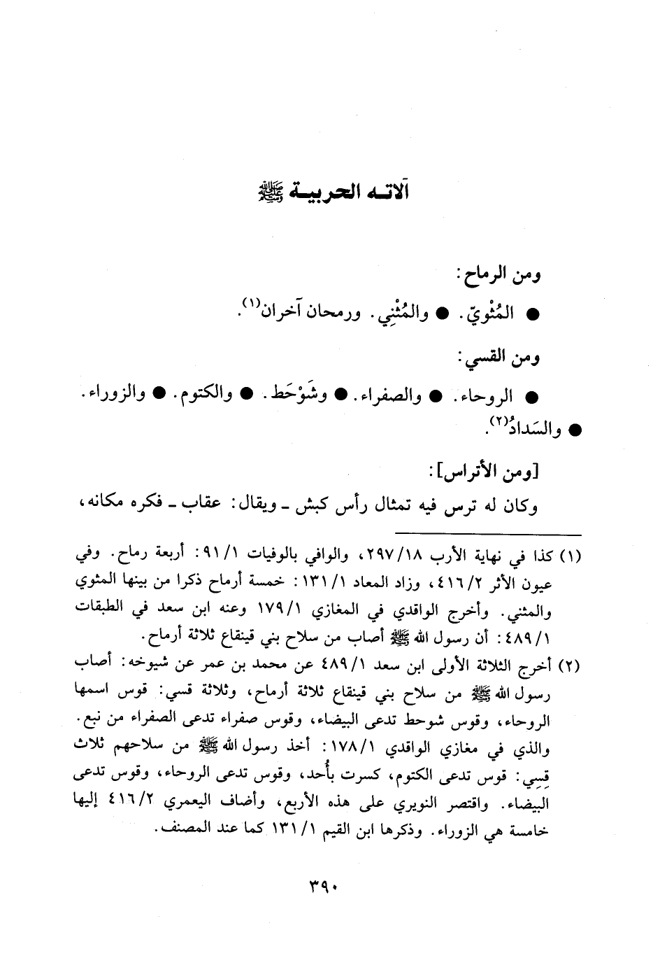 (¬2) أخرج الثلاثة الأولى ابن سعد 1/ 489 عن محمد بن عمر عن شيوخه: أصاب رسول الله صلى الله عليه وسلم من سلاح بني قينقاع ثلاثة أرماح، وثلاثة قسي: قوس اسمها الروحاء، وقوس شوحط تدعى البيضاء، وقوس صفراء تدعى الصفراء من نبع. والذي في مغازي الواقدي 1/ 178: أخذ رسول الله صلى الله عليه وسلم من سلاحهم ثلاث قسي: قوس تدعى الكتوم، كسرت بأحد، وقوس تدعى الروحاء، وقوس تدعى البيضاء. واقتصر النويري على هذه الأربع، وأضاف اليعمري 2/ 416 إليها خامسة هي الزوراء. وذكرها ابن القيم 1/ 131 كما عند المصنف.