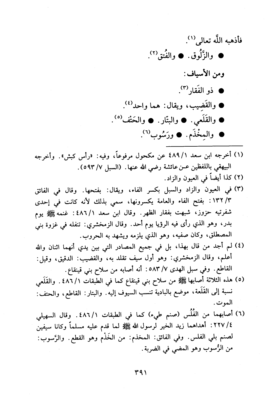 (¬3) في العيون والزاد والسبل بكسر الفاء، ويقال: بفتحها. وقال في الفائق 3/ 132: بفتح الفاء والعامة يكسرونها، سمي بذلك لأنه كانت في إحدى شفرتيه حزوز، شبهت بفقار الظهر. وقال ابن سعد 1/ 486: غنمه صلى الله عليه وسلم يوم بدر، وهو الذي رأى فيه الرؤيا يوم أحد. وقال الزمخشري: تنفله في غزوة بني المصطلق، وكان صفيه، وهو الذي يلزمه ويشهد به الحروب.