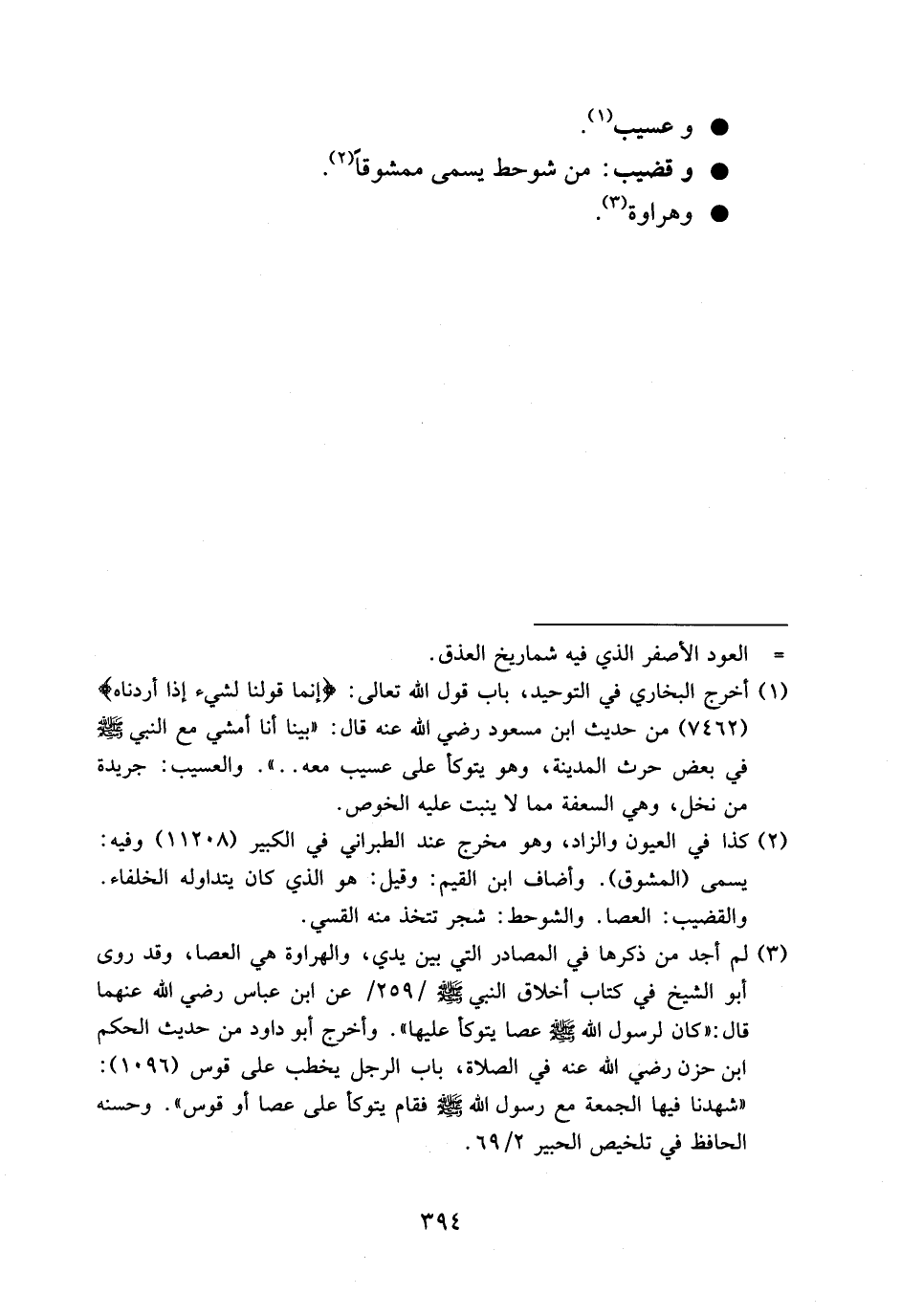 (¬1) أخرج البخاري في التوحيد، باب قول الله تعالى: إِنَّما قَوْلُنا لِشَيْءٍ إِذا أَرَدْناهُ (7462) من حديث ابن مسعود رضي الله عنه قال: «بينا أنا أمشي مع النبي صلى الله عليه وسلم في بعض حرث المدينة، وهو يتوكأ على عسيب معه. .». والعسيب: جريدة من نخل، وهي السعفة مما لا ينبت عليه الخوص.