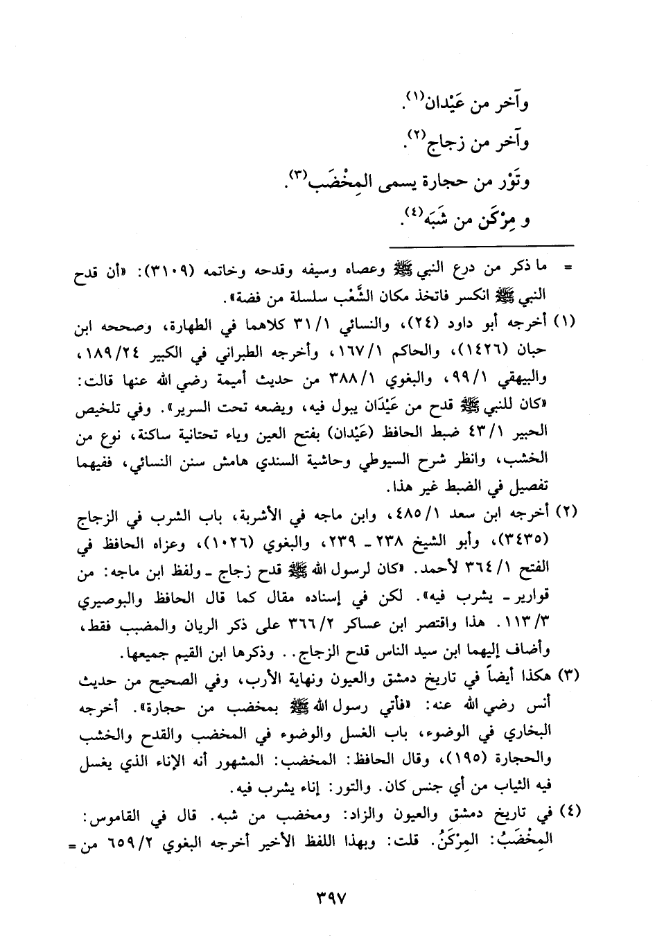(¬2) أخرجه ابن سعد 1/ 485، وابن ماجه في الأشربة، باب الشرب في الزجاج (3435)، وأبو الشيخ 238 - 239، والبغوي (1026)، وعزاه الحافظ في الفتح 1/ 364 لأحمد. «كان لرسول الله صلى الله عليه وسلم قدح زجاج-ولفظ ابن ماجه: من قوارير-يشرب فيه». لكن في إسناده مقال كما قال الحافظ والبوصيري 3/ 113. هذا واقتصر ابن عساكر 2/ 366 على ذكر الريان والمضبب فقط، وأضاف إليهما ابن سيد الناس قدح الزجاج. . وذكرها ابن القيم جميعها.