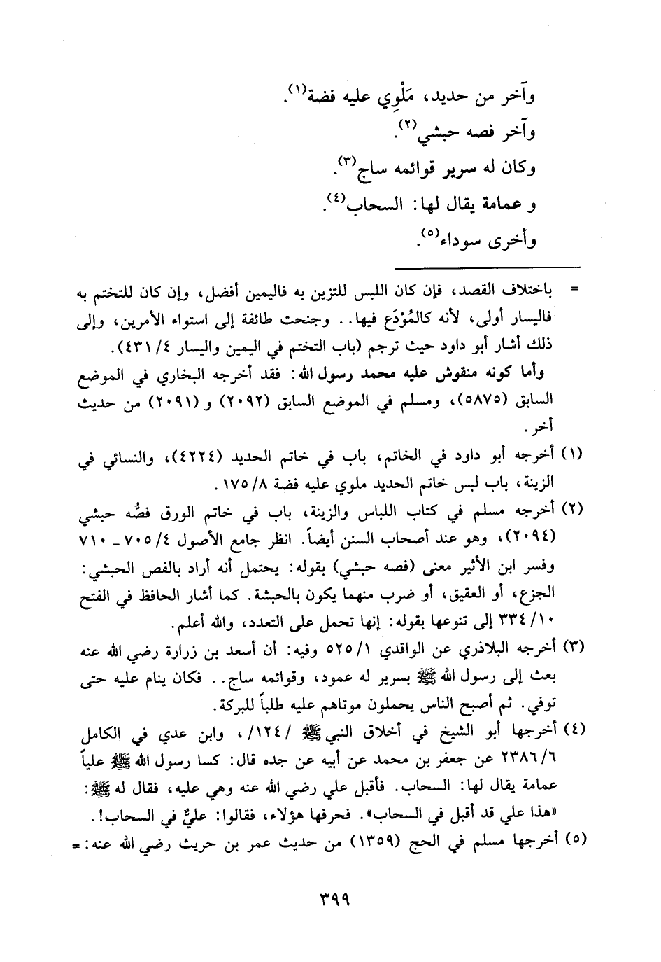 (¬2) أخرجه مسلم في كتاب اللباس والزينة، باب في خاتم الورق فصّه حبشي (2094)، وهو عند أصحاب السنن أيضا. انظر جامع الأصول 4/ 705 - 710 وفسر ابن الأثير معنى (فصه حبشي) بقوله: يحتمل أنه أراد بالفص الحبشي: الجزع، أو العقيق، أو ضرب منهما يكون بالحبشة. كما أشار الحافظ في الفتح 10/ 334 إلى تنوعها بقوله: إنها تحمل على التعدد، والله أعلم.