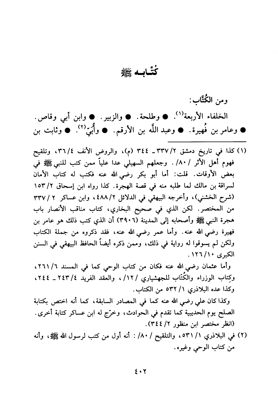 (¬1) كذا في تاريخ دمشق 2/ 337 - 344 (م)، والروض الأنف 4/ 36، وتلقيح فهوم أهل الأثر/80/. وجعلهم السهيلي عدا عليا ممن كتب للنبي صلى الله عليه وسلم في بعض الأوقات. قلت: أما أبو بكر رضي الله عنه فكتب له كتاب الأمان لسراقة بن مالك لما طلبه منه في قصة الهجرة. كذا رواه ابن إسحاق 2/ 153 (شرح الخشني)، وأخرجه البيهقي في الدلائل 2/ 488، وابن عساكر 2/ 337 من المختصر. لكن الذي في صحيح البخاري، كتاب مناقب الأنصار باب هجرة النبي صلى الله عليه وسلم وأصحابه إلى المدينة (3906) أن الذي كتب ذلك هو عامر بن فهيرة رضي الله عنه. وأما عمر رضي الله عنه، فقد ذكروه من جملة الكتاب ولكن لم يسوقوا له رواية في ذلك، وممن ذكره أيضا الحافظ البيهقي في السنن الكبرى 10/ 126. وأما عثمان رضي الله عنه فكان من كتاب الوحي كما في المسند 6/ 261، وكتاب الوزراء والكتّاب للجهشياري/12/، والعقد الفريد 4/ 243 - 244، وكذا عده البلاذري 1/ 532 من الكتاب. وكذا كان علي رضي الله عنه كما في المصادر السابقة، كما أنه اختص بكتابة الصلح يوم الحديبية كما تقدم في الحوادث، وخرّج له ابن عساكر كتابة أخرى. (انظر مختصر ابن منظور 2/ 344).