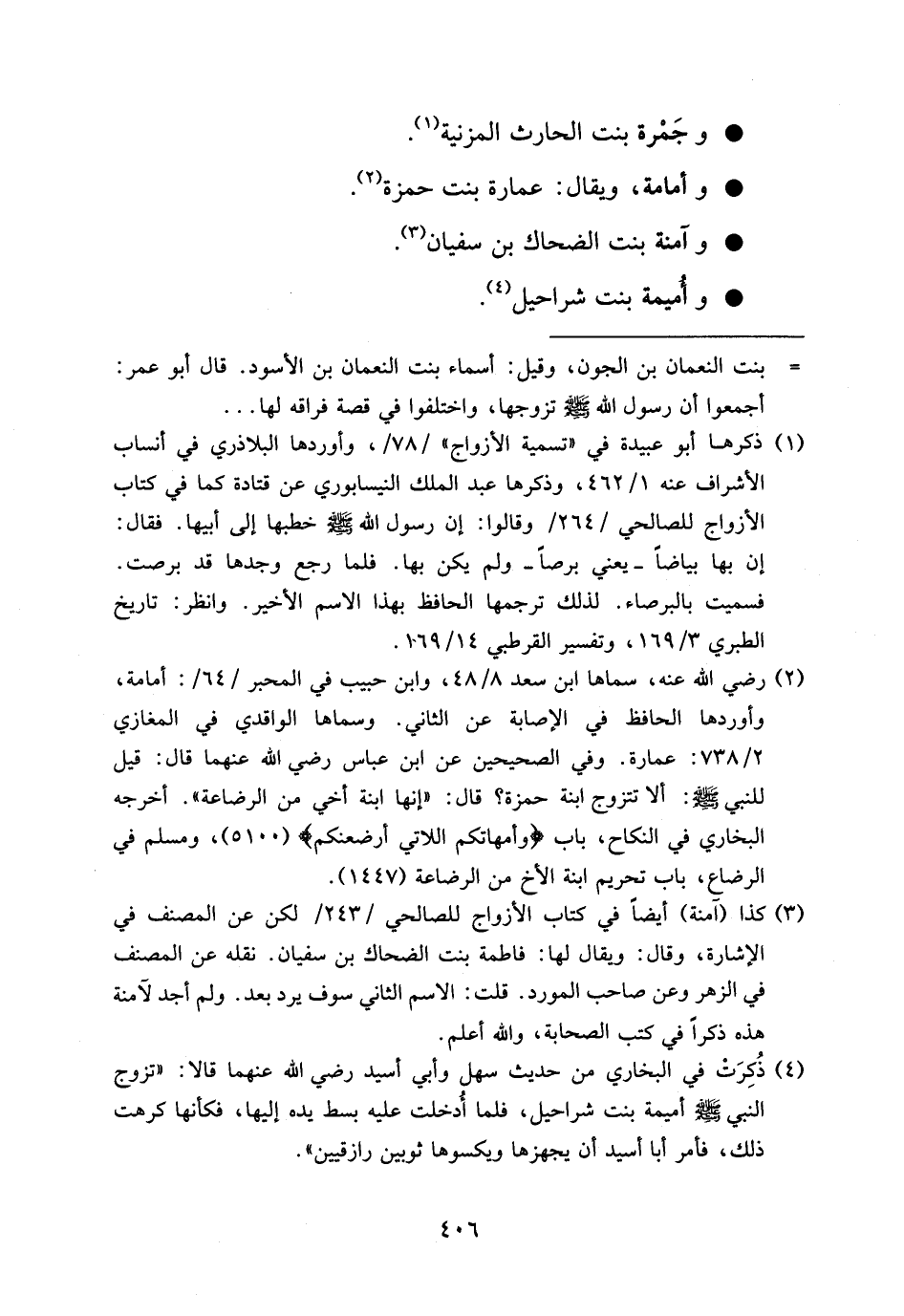(¬4) ذكرت في البخاري من حديث سهل وأبي أسيد رضي الله عنهما قالا: «تزوج النبي صلى الله عليه وسلم أميمة بنت شراحيل، فلما أدخلت عليه بسط يده إليها، فكأنها كرهت ذلك، فأمر أبا أسيد أن يجهزها ويكسوها ثوبين رازقيين».