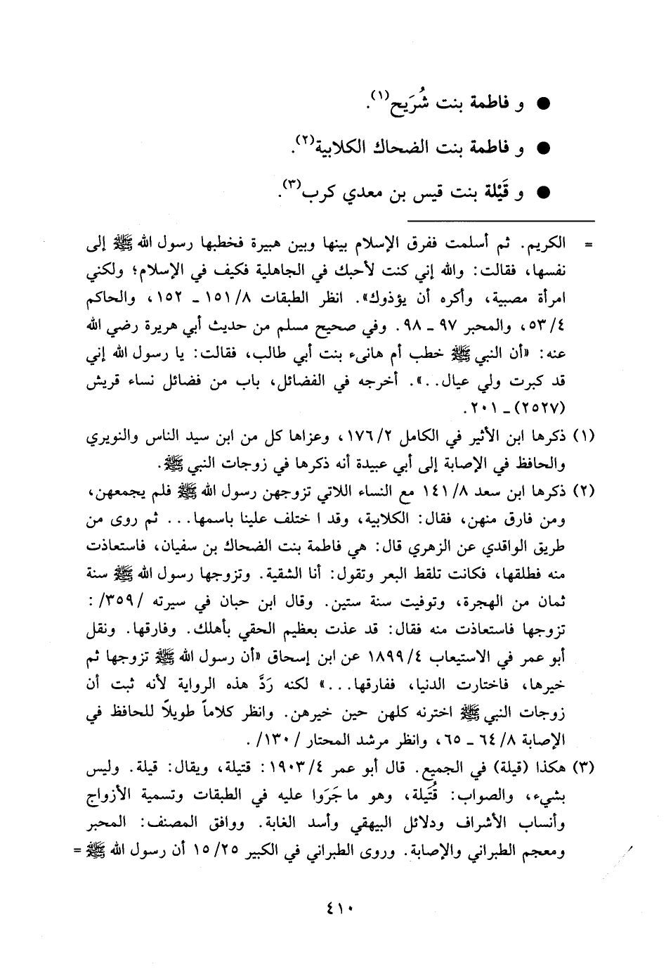 (¬3) هكذا (قيلة) في الجميع. قال أبو عمر 4/ 1903: قتيلة، ويقال: قيلة. وليس بشيء، والصواب: قتيلة، وهو ما جروا عليه في الطبقات وتسمية الأزواج وأنساب الأشراف ودلائل البيهقي وأسد الغابة. ووافق المصنف: المحبر ومعجم الطبراني والإصابة. وروى الطبراني في الكبير 25/ 15 أن رسول الله صلى الله عليه وسلم-