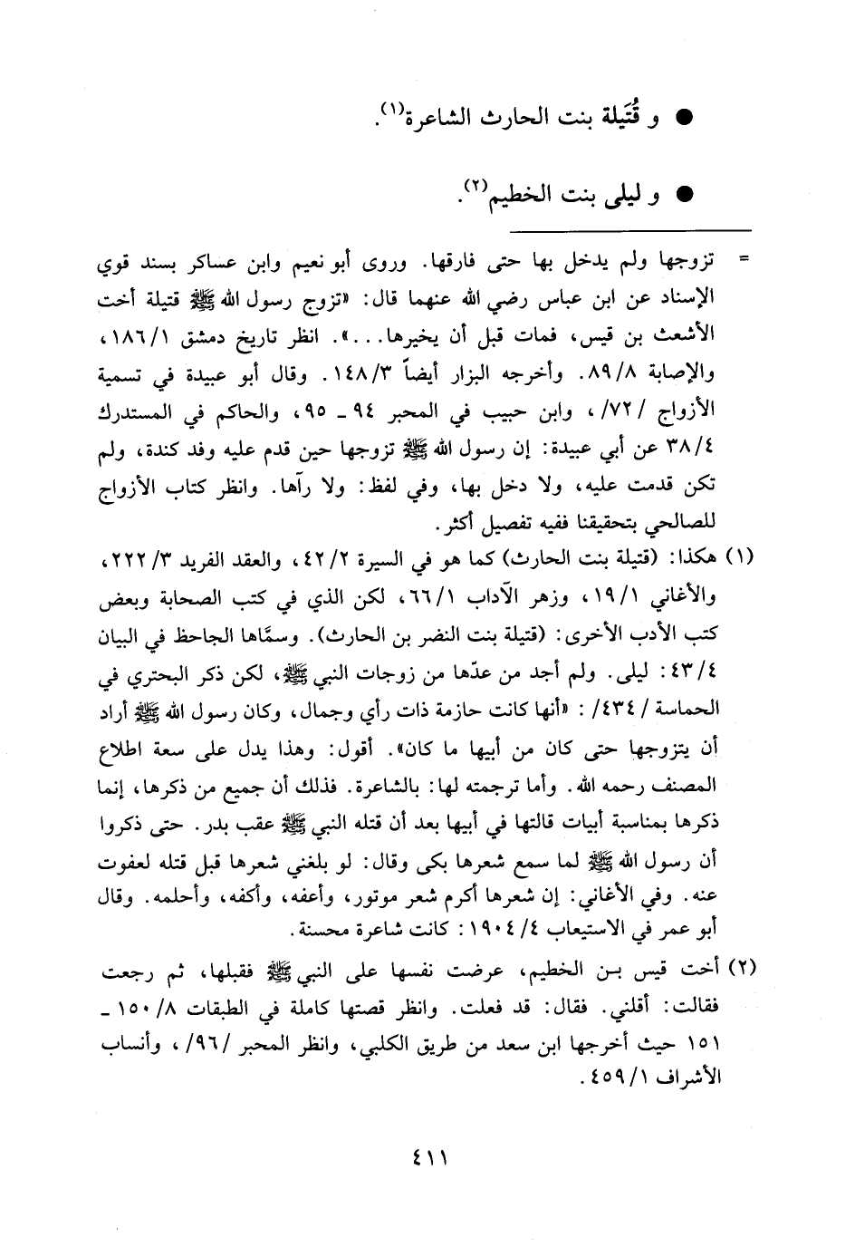 (¬1) هكذا: (قتيلة بنت الحارث) كما هو في السيرة 2/ 42، والعقد الفريد 3/ 222، والأغاني 1/ 19، وزهر الآداب 1/ 66، لكن الذي في كتب الصحابة وبعض كتب الأدب الأخرى: (قتيلة بنت النضر بن الحارث). وسمّاها الجاحظ في البيان 4/ 43: ليلى. ولم أجد من عدّها من زوجات النبي صلى الله عليه وسلم، لكن ذكر البحتري في الحماسة/434/: «أنها كانت حازمة ذات رأي وجمال، وكان رسول الله صلى الله عليه وسلم أراد أن يتزوجها حتى كان من أبيها ما كان». أقول: وهذا يدل على سعة اطلاع المصنف رحمه الله. وأما ترجمته لها: بالشاعرة. فذلك أن جميع من ذكرها، إنما ذكرها بمناسبة أبيات قالتها في أبيها بعد أن قتله النبي صلى الله عليه وسلم عقب بدر. حتى ذكروا أن رسول الله صلى الله عليه وسلم لما سمع شعرها بكى وقال: لو بلغني شعرها قبل قتله لعفوت عنه. وفي الأغاني: إن شعرها أكرم شعر موتور، وأعفه، وأكفه، وأحلمه. وقال أبو عمر في الاستيعاب 4/ 1904: كانت شاعرة محسنة.