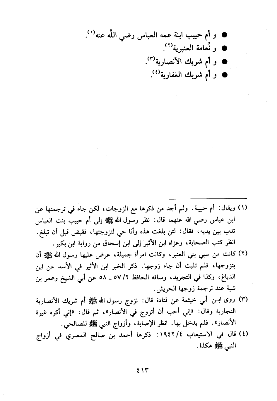 (¬1) ويقال: أم حبيبة. ولم أجد من ذكرها مع الزوجات، لكن جاء في ترجمتها عن ابن عباس رضي الله عنهما قال: نظر رسول الله صلى الله عليه وسلم إلى أم حبيب بنت العباس تدب بين يديه، فقال: لئن بلغت هذه وأنا حي لتزوجتها، فقبض قبل أن تبلغ. انظر كتب الصحابة، وعزاه ابن الأثير إلى ابن إسحاق من رواية ابن بكير.