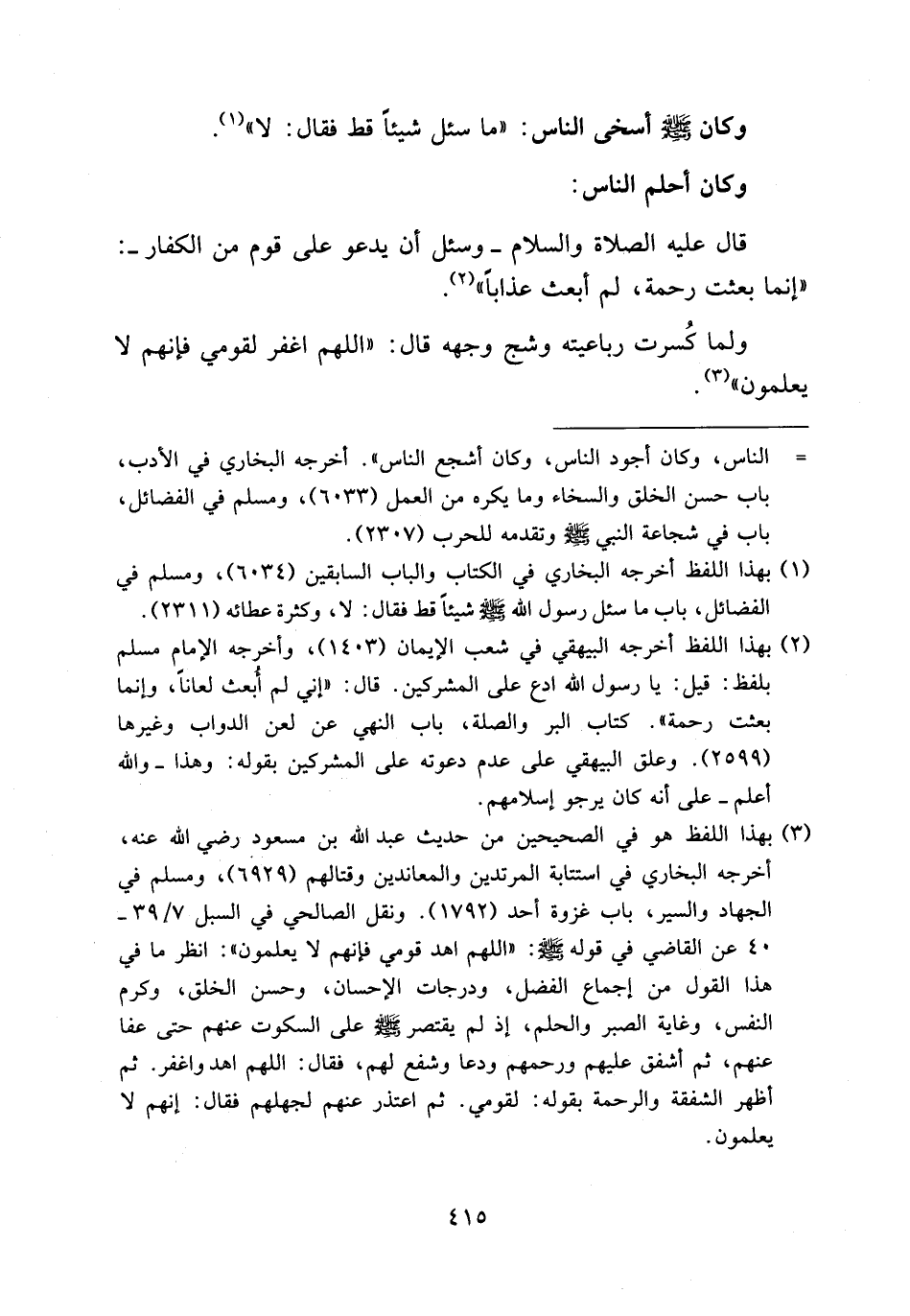 (¬3) بهذا اللفظ هو في الصحيحين من حديث عبد الله بن مسعود رضي الله عنه، أخرجه البخاري في استتابة المرتدين والمعاندين وقتالهم (6929)، ومسلم في الجهاد والسير، باب غزوة أحد (1792). ونقل الصالحي في السبل 7/ 39 - 40 عن القاضي في قوله صلى الله عليه وسلم: «اللهم اهد قومي فإنهم لا يعلمون»: انظر ما في هذا القول من إجماع الفضل، ودرجات الإحسان، وحسن الخلق، وكرم النفس، وغاية الصبر والحلم، إذ لم يقتصر صلى الله عليه وسلم على السكوت عنهم حتى عفا عنهم، ثم أشفق عليهم ورحمهم ودعا وشفع لهم، فقال: اللهم اهد واغفر. ثم أظهر الشفقة والرحمة بقوله: لقومي. ثم اعتذر عنهم لجهلهم فقال: إنهم لا يعلمون.
