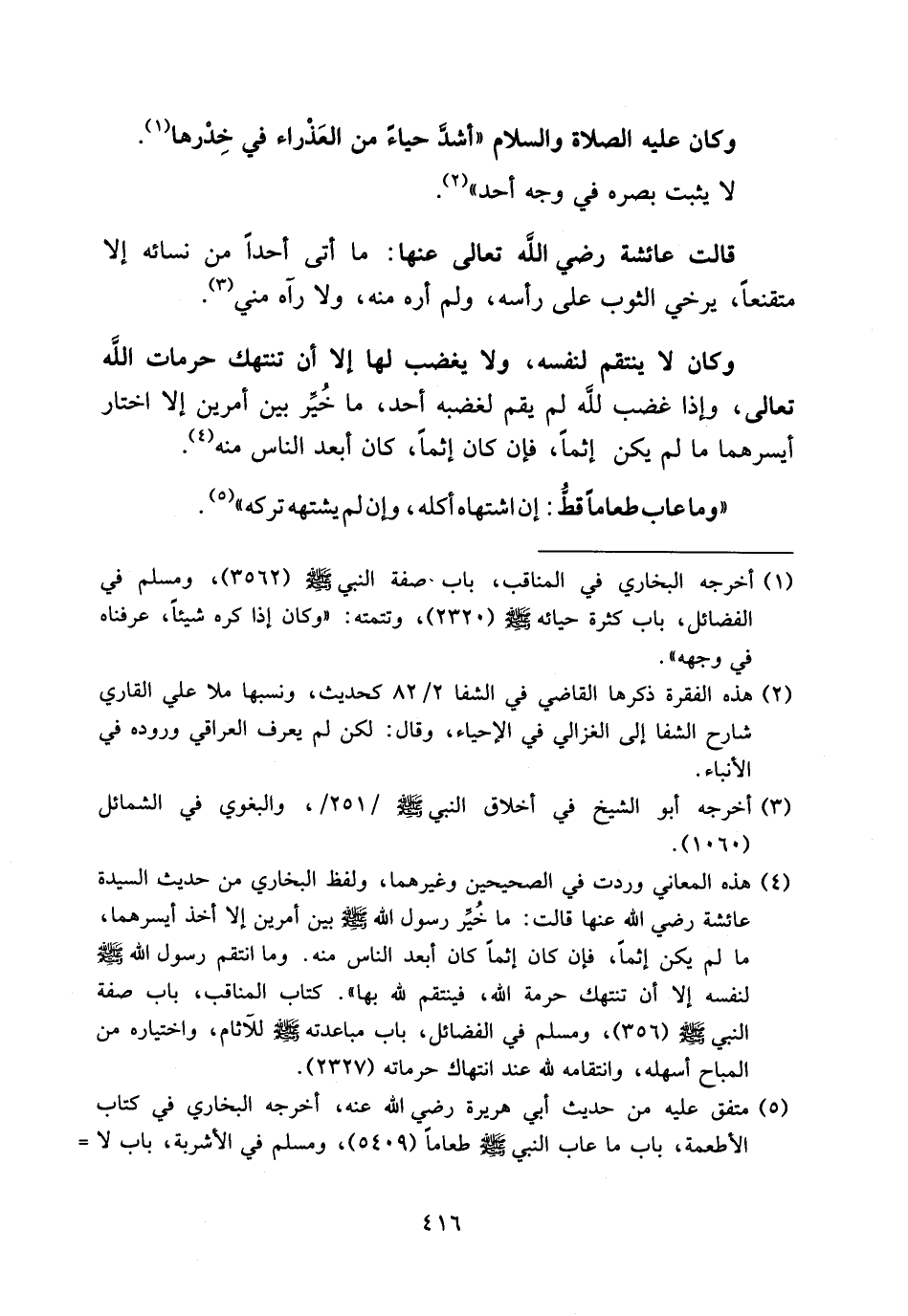 (¬4) هذه المعاني وردت في الصحيحين وغيرهما، ولفظ البخاري من حديث السيدة عائشة رضي الله عنها قالت: ما خيّر رسول الله صلى الله عليه وسلم بين أمرين إلا أخذ أيسرهما، ما لم يكن إثما، فإن كان إثما كان أبعد الناس منه. وما انتقم رسول الله صلى الله عليه وسلم لنفسه إلا أن تنتهك حرمة الله، فينتقم لله بها». كتاب المناقب، باب صفة النبي صلى الله عليه وسلم (356)، ومسلم في الفضائل، باب مباعدته صلى الله عليه وسلم للآثام، واختياره من المباح أسهله، وانتقامه لله عند انتهاك حرماته (2327).