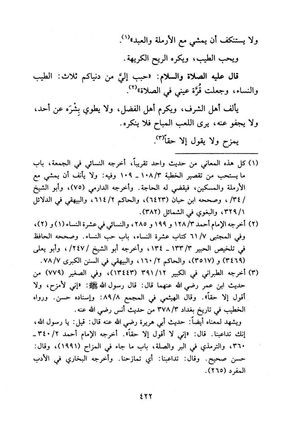 (¬3) أخرجه الطبراني في الكبير 12/ 391 (13443)، وفي الصغير (779) من حديث ابن عمر رضي الله عنهما قال: قال رسول الله صلى الله عليه وسلم: «إني لأمزح، ولا أقول إلا حقا». وقال الهيثمي في المجمع 8/ 89: وإسناده حسن. ورواه الخطيب في تاريخ بغداد 3/ 378 من حديث أنس رضي الله عنه. ويشهد لمعناه أيضا: حديث أبي هريرة رضي الله عنه قال: قيل: يا رسول الله، إنك تداعبنا. قال: «إني لا أقول إلا حقا». أخرجه الإمام أحمد 2/ 340 - 360، والترمذي في البر والصلة، باب ما جاء في المزاح (1991)، وقال: حسن صحيح. وقال: تداعبنا: أي تمازحنا. وأخرجه البخاري في الأدب المفرد (265).