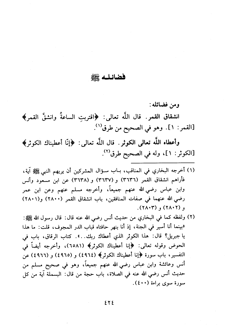 (¬1) أخرجه البخاري في المناقب، باب سؤال المشركين أن يريهم النبي صلى الله عليه وسلم آية، فأراهم انشقاق القمر (3636) و (3637) و (3638) عن ابن مسعود وأنس وابن عباس رضي الله عنهم جميعا، وأخرجه مسلم عنهم وعن ابن عمر رضي الله عنهما في صفات المنافقين، باب انشقاق القمر (2800) و (2801) و (2802) و (2803).