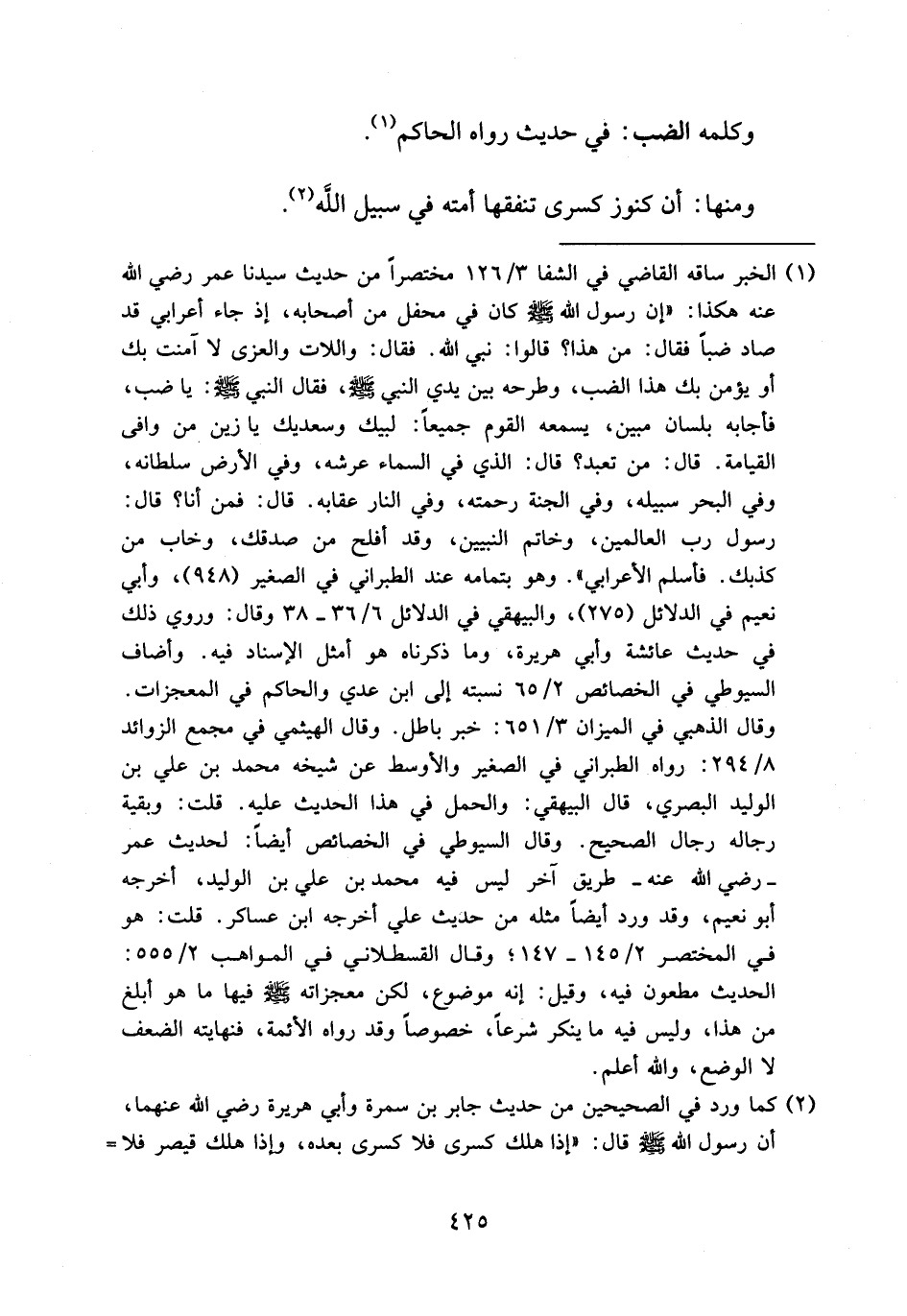 (¬1) الخبر ساقه القاضي في الشفا 3/ 126 مختصرا من حديث سيدنا عمر رضي الله عنه هكذا: «إن رسول الله صلى الله عليه وسلم كان في محفل من أصحابه، إذ جاء أعرابي قد صاد ضبا فقال: من هذا؟ قالوا: نبي الله. فقال: واللات والعزى لا آمنت بك أو يؤمن بك هذا الضب، وطرحه بين يدي النبي صلى الله عليه وسلم، فقال النبي صلى الله عليه وسلم: يا ضب، فأجابه بلسان مبين، يسمعه القوم جميعا: لبيك وسعديك يا زين من وافى القيامة. قال: من تعبد؟ قال: الذي في السماء عرشه، وفي الأرض سلطانه، وفي البحر سبيله، وفي الجنة رحمته، وفي النار عقابه. قال: فمن أنا؟ قال: رسول رب العالمين، وخاتم النبيين، وقد أفلح من صدقك، وخاب من كذبك. فأسلم الأعرابي». وهو بتمامه عند الطبراني في الصغير (948)، وأبي نعيم في الدلائل (275)، والبيهقي في الدلائل 6/ 36 - 38 وقال: وروي ذلك في حديث عائشة وأبي هريرة، وما ذكرناه هو أمثل الإسناد فيه. وأضاف السيوطي في الخصائص 2/ 65 نسبته إلى ابن عدي والحاكم في المعجزات. وقال الذهبي في الميزان 3/ 651: خبر باطل. وقال الهيثمي في مجمع الزوائد 8/ 294: رواه الطبراني في الصغير والأوسط عن شيخه محمد بن علي بن الوليد البصري، قال البيهقي: والحمل في هذا الحديث عليه. قلت: وبقية رجاله رجال الصحيح. وقال السيوطي في الخصائص أيضا: لحديث عمر -رضي الله عنه-طريق آخر ليس فيه محمد بن علي بن الوليد، أخرجه أبو نعيم، وقد ورد أيضا مثله من حديث علي أخرجه ابن عساكر. قلت: هو في المختصر 2/ 145 - 147؛ وقال القسطلاني في المواهب 2/ 555: الحديث مطعون فيه، وقيل: إنه موضوع، لكن معجزاته صلى الله عليه وسلم فيها ما هو أبلغ من هذا، وليس فيه ما ينكر شرعا، خصوصا وقد رواه الأئمة، فنهايته الضعف لا الوضع، والله أعلم.