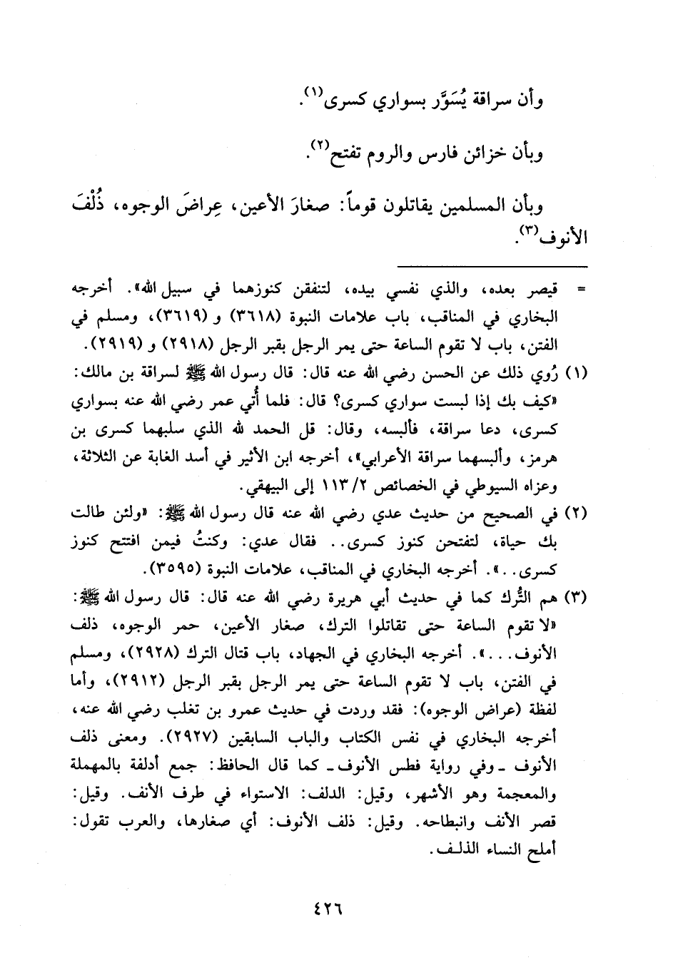 (¬2) في الصحيح من حديث عدي رضي الله عنه قال رسول الله صلى الله عليه وسلم: «ولئن طالت بك حياة، لتفتحن كنوز كسرى. . فقال عدي: وكنت فيمن افتتح كنوز كسرى. .». أخرجه البخاري في المناقب، علامات النبوة (3595).