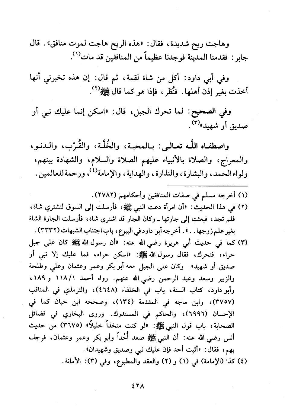 (¬3) كما في حديث أبي هريرة رضي الله عنه: «أن رسول الله صلى الله عليه وسلم كان على جبل حراء، فتحرك، فقال رسول الله صلى الله عليه وسلم: «اسكن حراء، فما عليك إلا نبي أو صديق أو شهيد». وكان على الجبل معه أبو بكر وعمر وعثمان وعلي وطلحة والزبير وسعد وعبد الرحمن رضي الله عنهم. رواه أحمد 1/ 118 و 189، وأبو داود، كتاب السنة، باب في الخلفاء (4648)، والترمذي في المناقب (3757)، وابن ماجه في المقدمة (134)، وصححه ابن حبان كما في الإحسان (6996)، والحاكم في المستدرك. وروى البخاري في فضائل الصحابة، باب قول النبي صلى الله عليه وسلم: «لو كنت متخذا خليلا» (3675) من حديث أنس رضي الله عنه: أن النبي صلى الله عليه وسلم صعد أحدا وأبو بكر وعمر وعثمان، فرجف بهم، فقال: «أثبت أحد فإن عليك نبي وصديق وشهيدان».