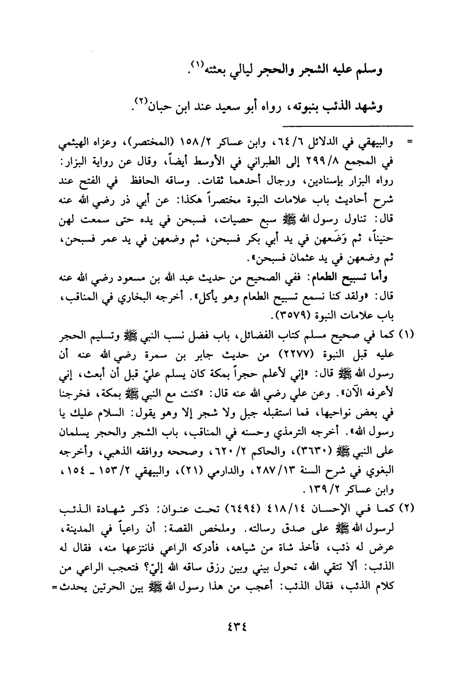 (¬2) كما في الإحسان 14/ 418 (6494) تحت عنوان: ذكر شهادة الذئب لرسول الله صلى الله عليه وسلم على صدق رسالته. وملخص القصة: أن راعيا في المدينة، عرض له ذئب، فأخذ شاة من شياهه، فأدركه الراعي فانتزعها منه، فقال له الذئب: ألا تتقي الله، تحول بيني وبين رزق ساقه الله إليّ؟ فتعجب الراعي من كلام الذئب، فقال الذئب: أعجب من هذا رسول الله صلى الله عليه وسلم بين الحرتين يحدث-