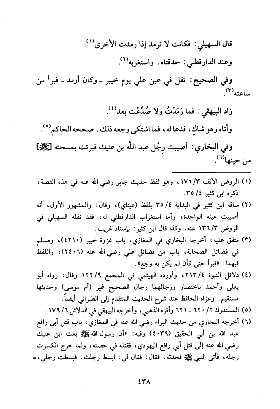 (¬6) أخرجه البخاري من حديث البراء رضي الله عنه في المغازي، باب قتل أبي رافع عبد الله بن أبي الحقيق (4039) وفيه: «أن رسول الله صلى الله عليه وسلم بعث ابن عتيك رضي الله عنه إلى قتل أبي رافع اليهودي، فقتله في حصنه، ولما خرج انكسرت رجله، فأتى النبي صلى الله عليه وسلم فحدثه، فقال: فقال لي: ابسط رجلك. فبسطت رجلي، -