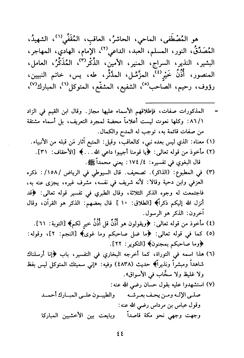 هو المصطفى، الماحي، الحاشر، العاقب، المقفّي (¬1)، الشهيد، المصدّق، النور، المسلم، العبد، الداعي (¬2)، الإمام، الهادي، المهاجر، البشير، النذير، السراج، المنير، الأمين، الذّكر (¬3)، المذكّر، العامل، المنصور، أذن خير (¬4)، المزّمّل، المدّثّر، طه، يس، خاتم النبيين، رؤوف، رحيم، الصاحب (¬5)، الشفيع، المشفّع، المتوكل (¬6)، المبارك (¬7)،