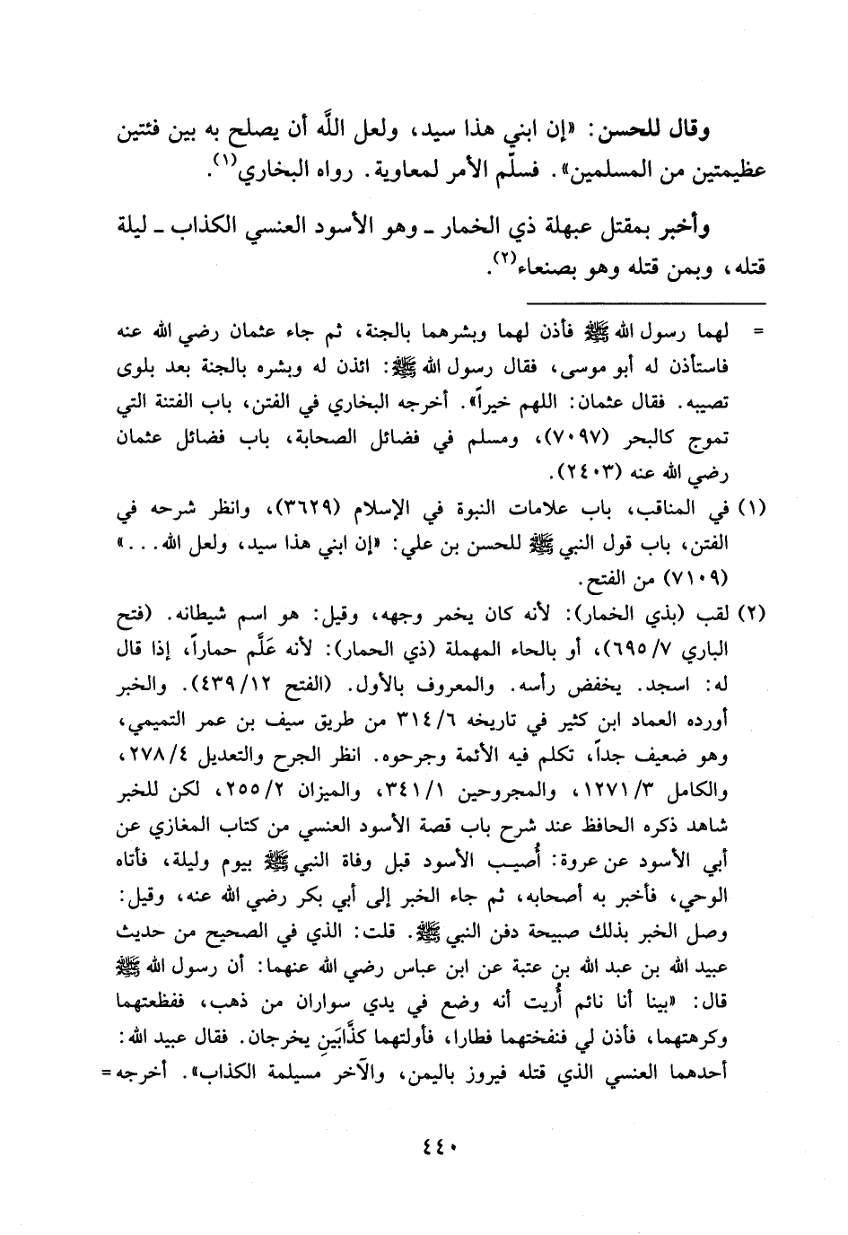 (¬1) في المناقب، باب علامات النبوة في الإسلام (3629)، وانظر شرحه في الفتن، باب قول النبي صلى الله عليه وسلم للحسن بن علي: «إن ابني هذا سيد، ولعل الله. . .» (7109) من الفتح.