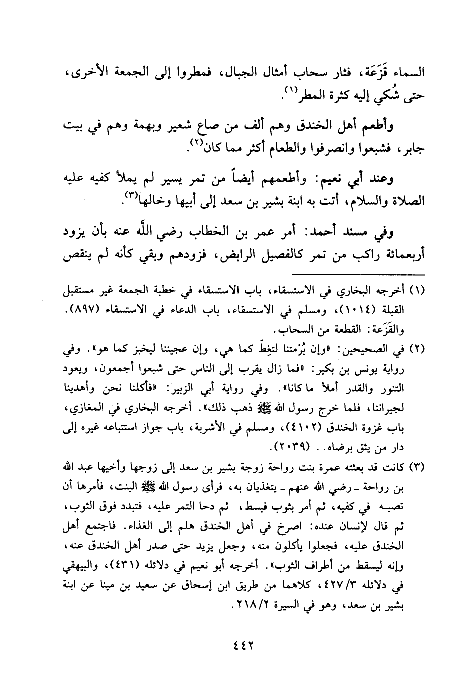 (¬3) كانت قد بعثته عمرة بنت رواحة زوجة بشير بن سعد إلى زوجها وأخيها عبد الله بن رواحة-رضي الله عنهم-يتغذيان به، فرأى رسول الله صلى الله عليه وسلم البنت، فأمرها أن تصبه في كفيه، ثم أمر بثوب فبسط، ثم دحا التمر عليه، فتبدد فوق الثوب، ثم قال لإنسان عنده: اصرخ في أهل الخندق هلم إلى الغذاء. فاجتمع أهل الخندق عليه، فجعلوا يأكلون منه، وجعل يزيد حتى صدر أهل الخندق عنه، وإنه ليسقط من أطراف الثوب». أخرجه أبو نعيم في دلائله (431)، والبيهقي في دلائله 3/ 427، كلاهما من طريق ابن إسحاق عن سعيد بن مينا عن ابنة بشير بن سعد، وهو في السيرة 2/ 218.