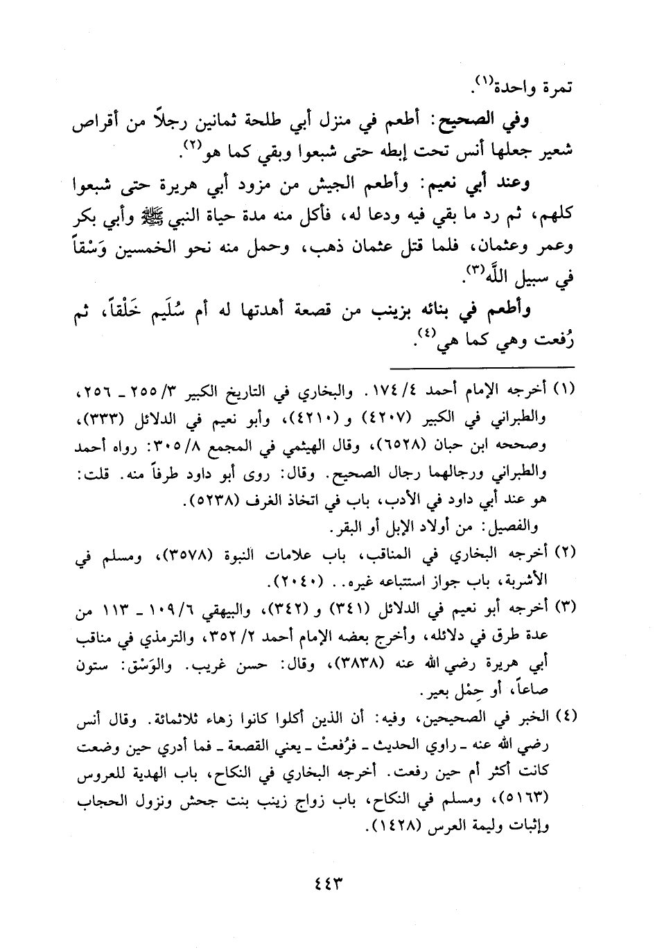 (¬4) الخبر في الصحيحين، وفيه: أن الذين أكلوا كانوا زهاء ثلاثمائة. وقال أنس رضي الله عنه-راوي الحديث-فرفعت-يعني القصعة-فما أدري حين وضعت كانت أكثر أم حين رفعت. أخرجه البخاري في النكاح، باب الهدية للعروس (5163)، ومسلم في النكاح، باب زواج زينب بنت جحش ونزول الحجاب وإثبات وليمة العرس (1428).