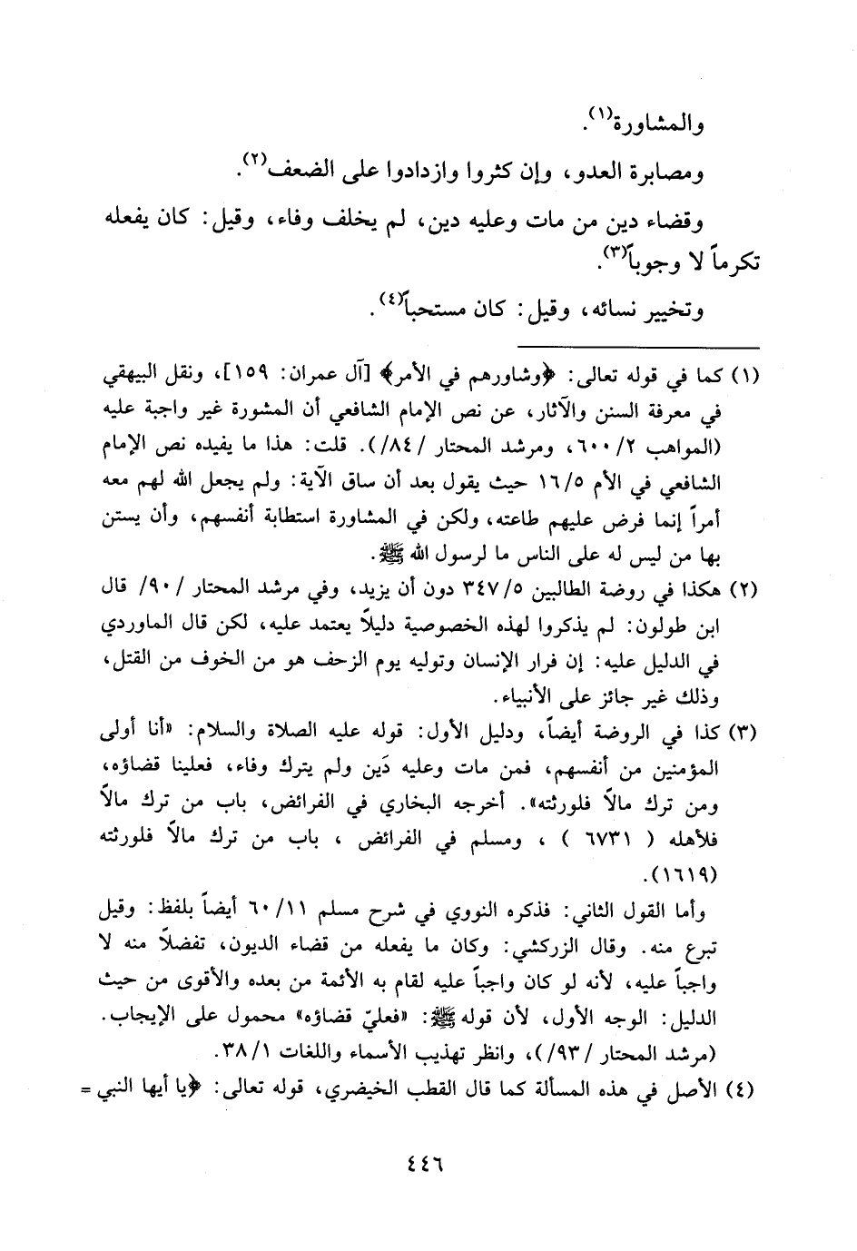 (¬1) كما في قوله تعالى: وَشاوِرْهُمْ فِي الْأَمْرِ [آل عمران:159]، ونقل البيهقي في معرفة السنن والآثار، عن نص الإمام الشافعي أن المشورة غير واجبة عليه (المواهب 2/ 600، ومرشد المحتار/84/). قلت: هذا ما يفيده نص الإمام الشافعي في الأم 5/ 16 حيث يقول بعد أن ساق الآية: ولم يجعل الله لهم معه أمرا إنما فرض عليهم طاعته، ولكن في المشاورة استطابة أنفسهم، وأن يستن بها من ليس له على الناس ما لرسول الله صلى الله عليه وسلم.