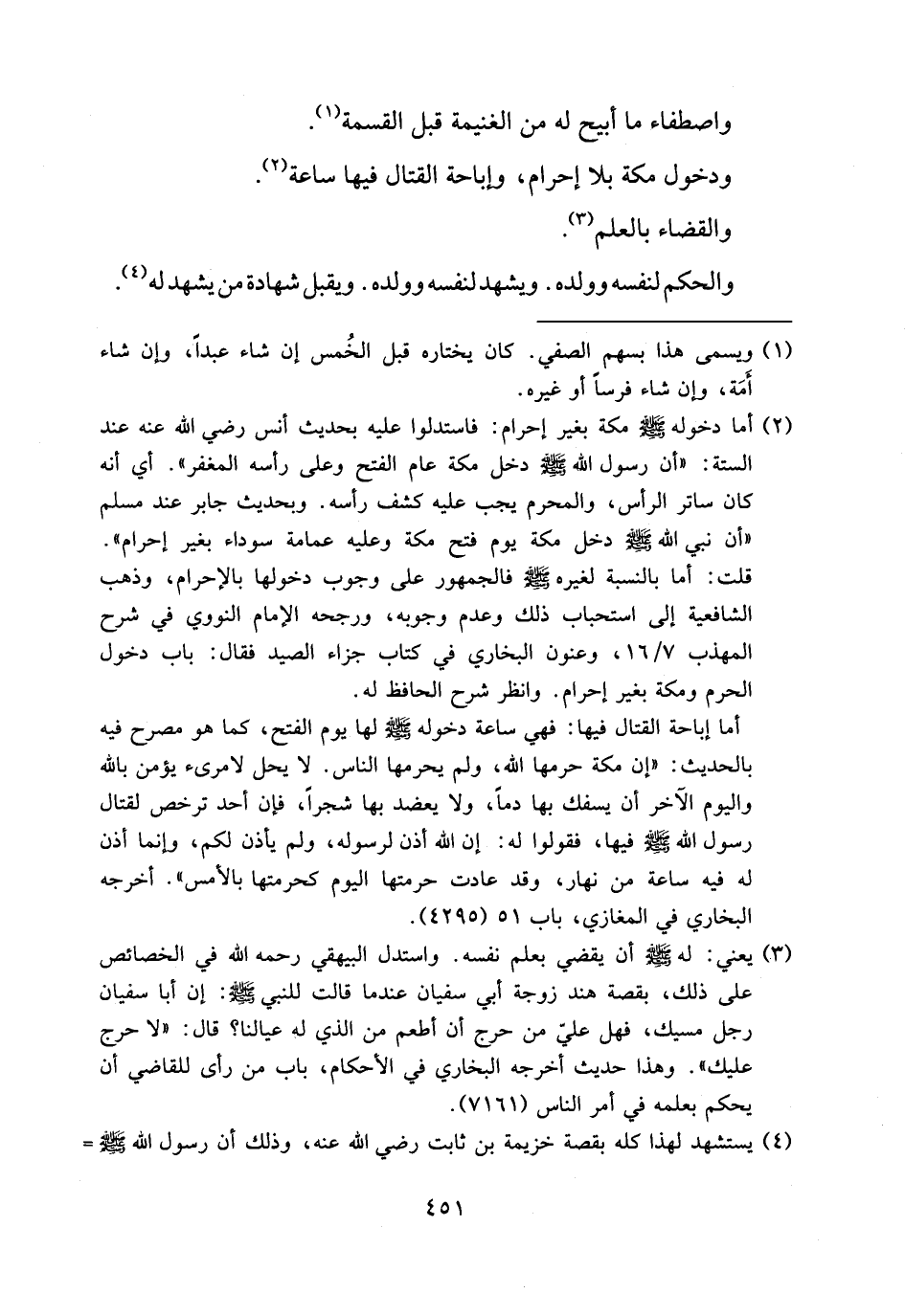 (¬3) يعني: له صلى الله عليه وسلم أن يقضي بعلم نفسه. واستدل البيهقي رحمه الله في الخصائص على ذلك، بقصة هند زوجة أبي سفيان عندما قالت للنبي صلى الله عليه وسلم: إن أبا سفيان رجل مسيك، فهل عليّ من حرج أن أطعم من الذي له عيالنا؟ قال: «لا حرج عليك». وهذا حديث أخرجه البخاري في الأحكام، باب من رأى للقاضي أن يحكم بعلمه في أمر الناس (7161).