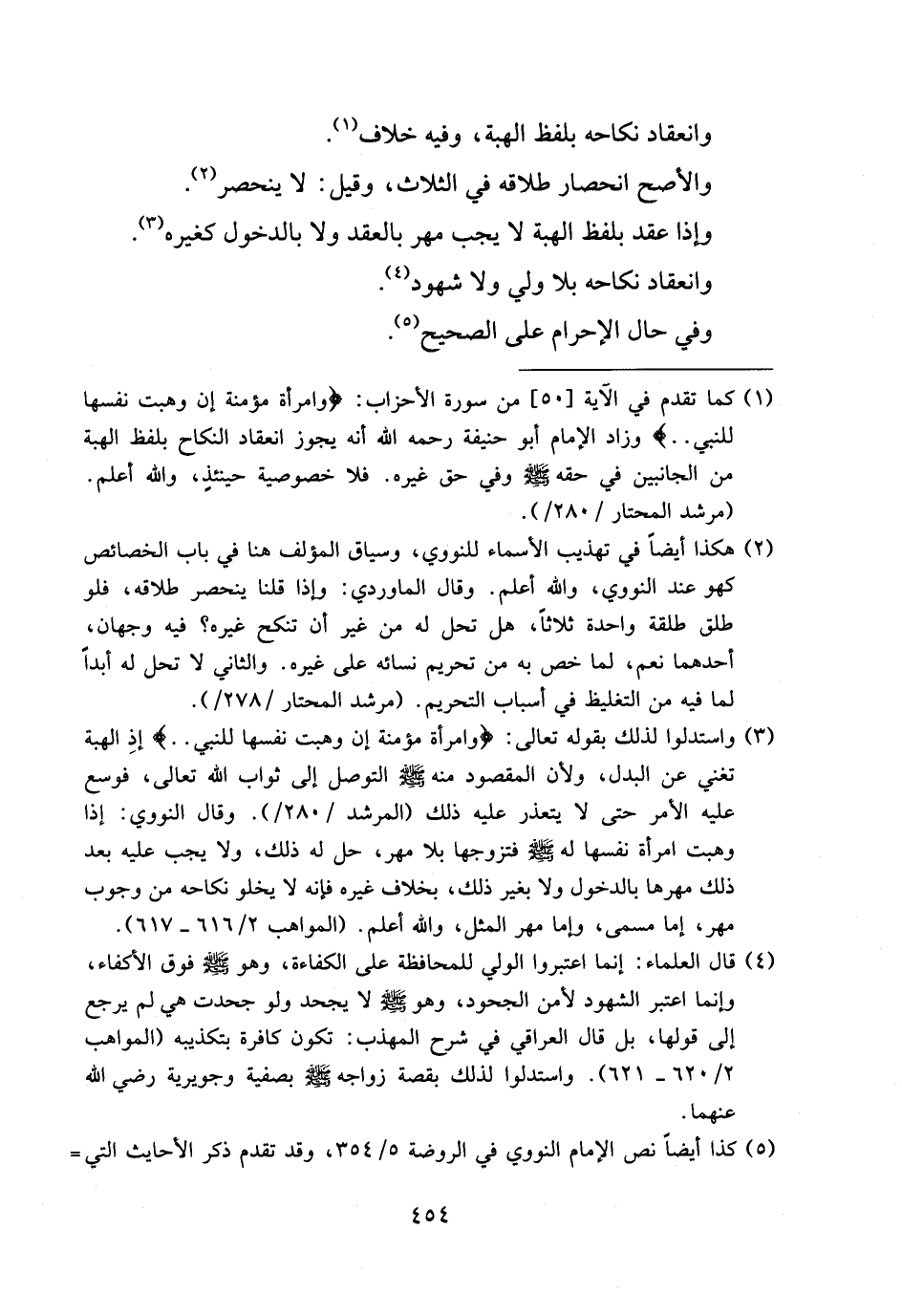 (¬3) واستدلوا لذلك بقوله تعالى: وَاِمْرَأَةً مُؤْمِنَةً إِنْ وَهَبَتْ نَفْسَها لِلنَّبِيِّ. . إذ الهبة تغني عن البدل، ولأن المقصود منه صلى الله عليه وسلم التوصل إلى ثواب الله تعالى، فوسع عليه الأمر حتى لا يتعذر عليه ذلك (المرشد/280/). وقال النووي: إذا وهبت امرأة نفسها له صلى الله عليه وسلم فتزوجها بلا مهر، حل له ذلك، ولا يجب عليه بعد ذلك مهرها بالدخول ولا بغير ذلك، بخلاف غيره فإنه لا يخلو نكاحه من وجوب مهر، إما مسمى، وإما مهر المثل، والله أعلم. (المواهب 2/ 616 - 617).