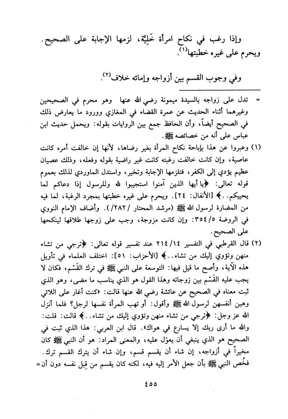 (¬2) قال القرطبي في التفسير 14/ 214 عند تفسير قوله تعالى: تُرْجِي مَنْ تَشاءُ مِنْهُنَّ وَتُؤْوِي إِلَيْكَ مَنْ تَشاءُ. . [الأحزاب:51]: اختلف العلماء في تأويل هذه الآية، وأصح ما قيل فيها: التوسعة على النبي صلى الله عليه وسلم في ترك القسم، فكان لا يجب عليه القسم بين زوجاته وهذا القول هو الذي يناسب ما مضى، وهو الذي ثبت معناه في الصحيح عن عائشة رضي الله عنها قالت: «كنت أغار على اللائي وهبن أنفسهن لرسول الله صلى الله عليه وسلم وأقول: أو تهب المرأة نفسها لرجل؟ فلما أنزل الله عز وجل: تُرْجِي مَنْ تَشاءُ مِنْهُنَّ وَتُؤْوِي إِلَيْكَ مَنْ تَشاءُ. . قالت: قلت: والله ما أرى ربك إلا يسارع في هواك». قال ابن العربي: هذا الذي ثبت في الصحيح هو الذي ينبغي أن يعوّل عليه، والمعنى المراد: هو أن النبي صلى الله عليه وسلم كان مخيرا في أزواجه، إن شاء أن يقسم قسم، وإن شاء أن يترك القسم ترك. فخص النبي صلى الله عليه وسلم بأن جعل الأمر إليه فيه، لكنه كان يقسم من قبل نفسه دون أن-