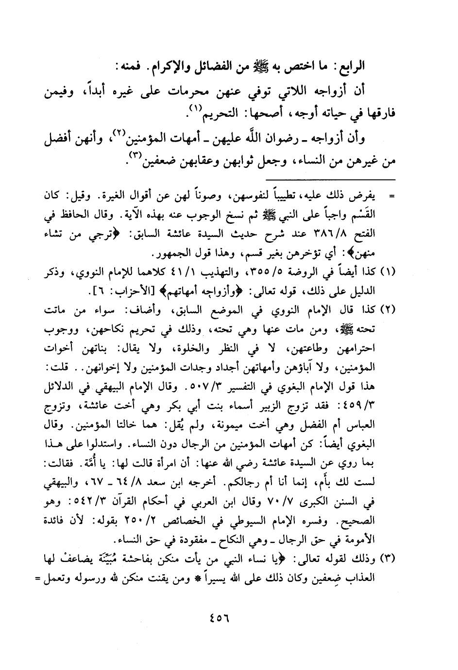 (¬3) وذلك لقوله تعالى: يا نِساءَ النَّبِيِّ مَنْ يَأْتِ مِنْكُنَّ بِفاحِشَةٍ مُبَيِّنَةٍ يُضاعَفْ لَهَا الْعَذابُ ضِعْفَيْنِ وَكانَ ذلِكَ عَلَى اللهِ يَسِيراً* وَمَنْ يَقْنُتْ مِنْكُنَّ لِلّهِ وَرَسُولِهِ وَتَعْمَلْ -