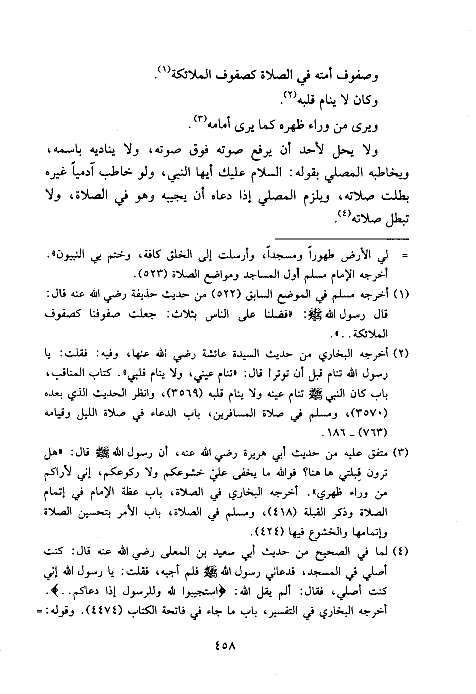 (¬3) متفق عليه من حديث أبي هريرة رضي الله عنه، أن رسول الله صلى الله عليه وسلم قال: «هل ترون قبلتي ها هنا؟ فو الله ما يخفى عليّ خشوعكم ولا ركوعكم، إني لأراكم من وراء ظهري». أخرجه البخاري في الصلاة، باب عظة الإمام في إتمام الصلاة وذكر القبلة (418)، ومسلم في الصلاة، باب الأمر بتحسين الصلاة وإتمامها والخشوع فيها (424).