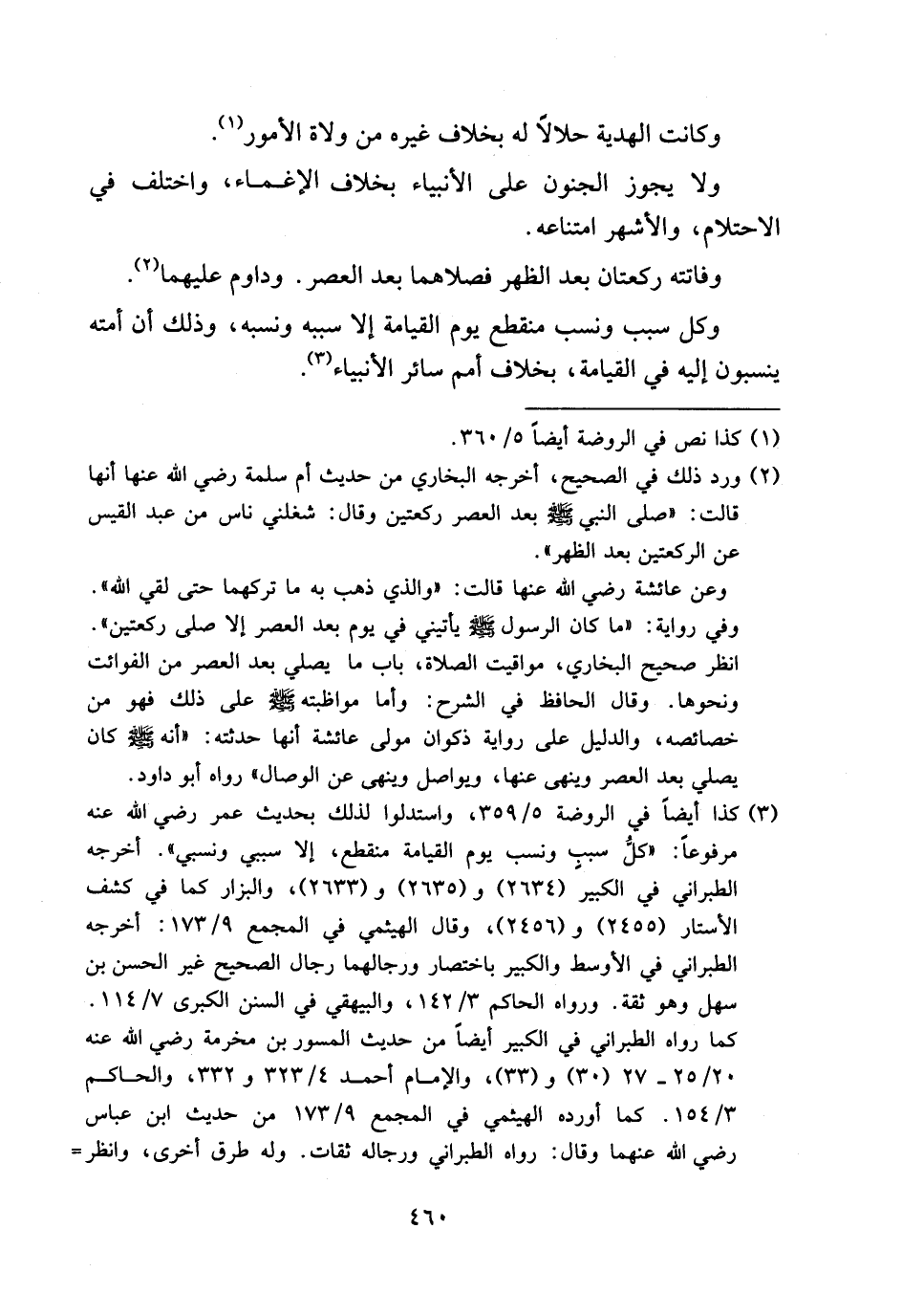 (¬3) كذا أيضا في الروضة 5/ 359، واستدلوا لذلك بحديث عمر رضي الله عنه مرفوعا: «كلّ سبب ونسب يوم القيامة منقطع، إلا سببي ونسبي». أخرجه الطبراني في الكبير (2634) و (2635) و (2633)، والبزار كما في كشف الأستار (2455) و (2456)، وقال الهيثمي في المجمع 9/ 173: أخرجه الطبراني في الأوسط والكبير باختصار ورجالهما رجال الصحيح غير الحسن بن سهل وهو ثقة. ورواه الحاكم 3/ 142، والبيهقي في السنن الكبرى 7/ 114. كما رواه الطبراني في الكبير أيضا من حديث المسور بن مخرمة رضي الله عنه 20/ 25 - 27 (30) و (33)، والإمام أحمد 4/ 323 و 332، والحاكم 3/ 154. كما أورده الهيثمي في المجمع 9/ 173 من حديث ابن عباس رضي الله عنهما وقال: رواه الطبراني ورجاله ثقات. وله طرق أخرى، وانظر-