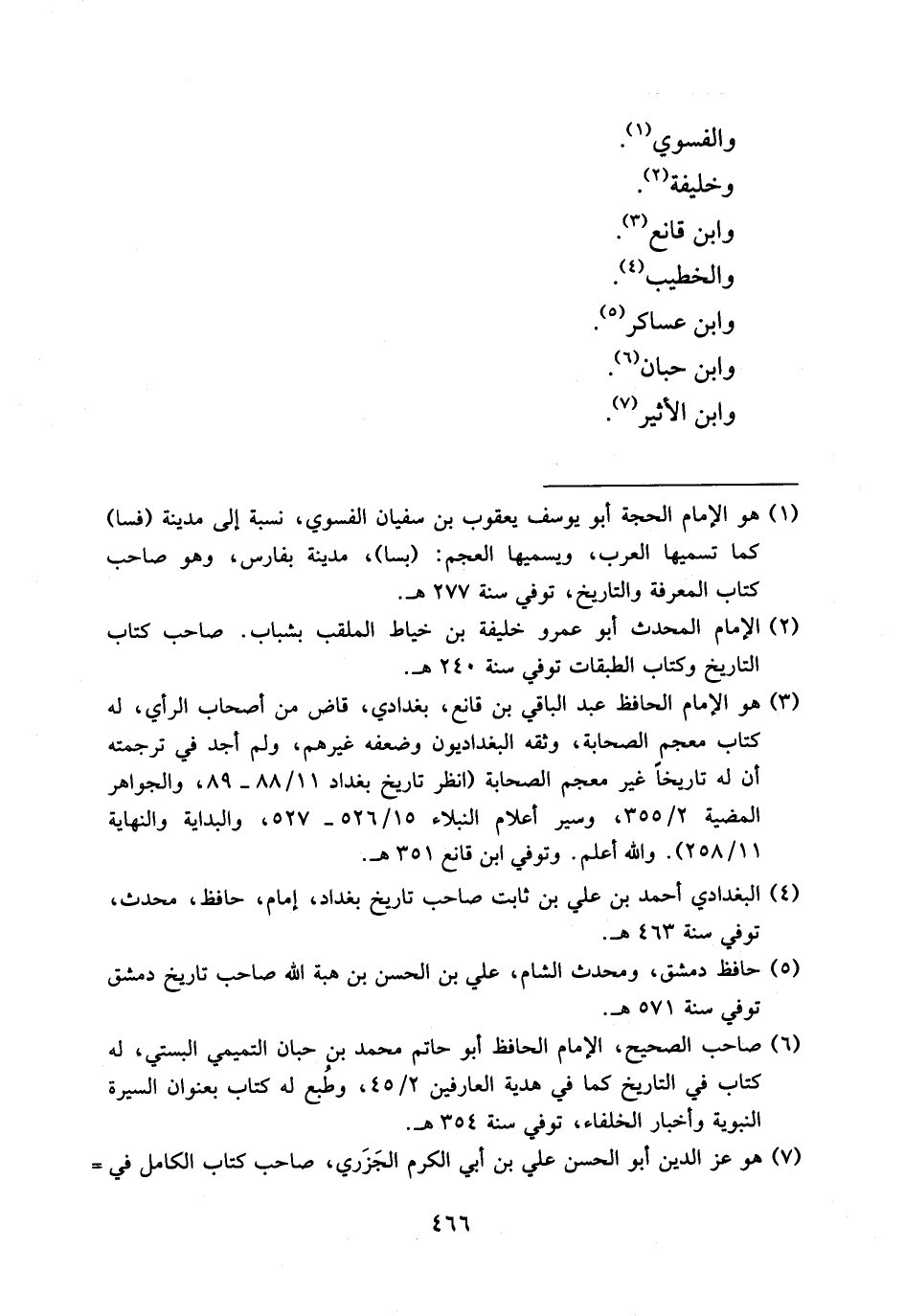 (¬1) هو الإمام الحجة أبو يوسف يعقوب بن سفيان الفسوي، نسبة إلى مدينة (فسا) كما تسميها العرب، ويسميها العجم: (بسا)، مدينة بفارس، وهو صاحب كتاب المعرفة والتاريخ، توفي سنة 277 هـ.