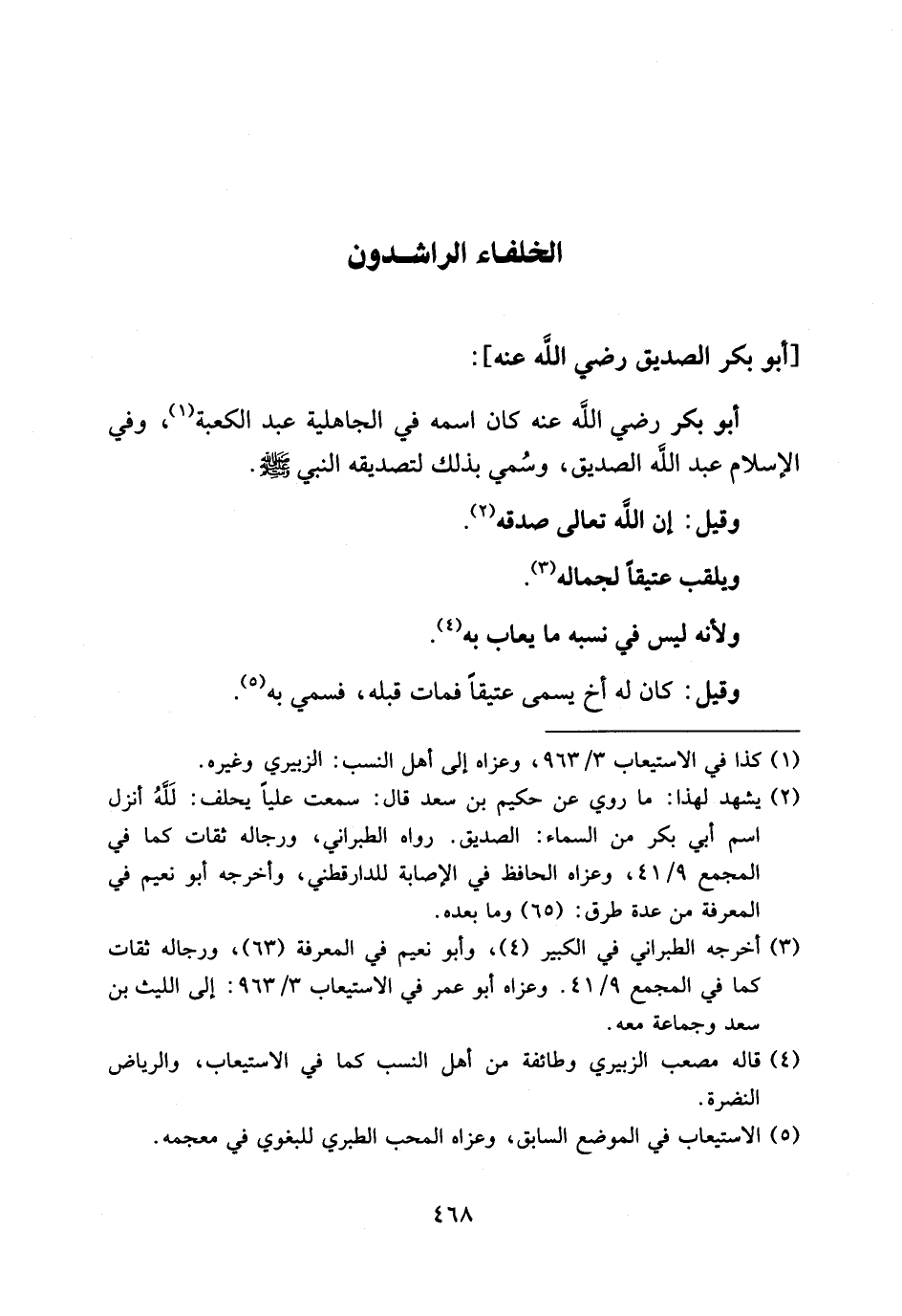 أبو بكر رضي الله عنه كان اسمه في الجاهلية عبد الكعبة (¬1)، وفي الإسلام عبد الله الصديق، وسمي بذلك لتصديقه النبي صلى الله عليه وسلم.