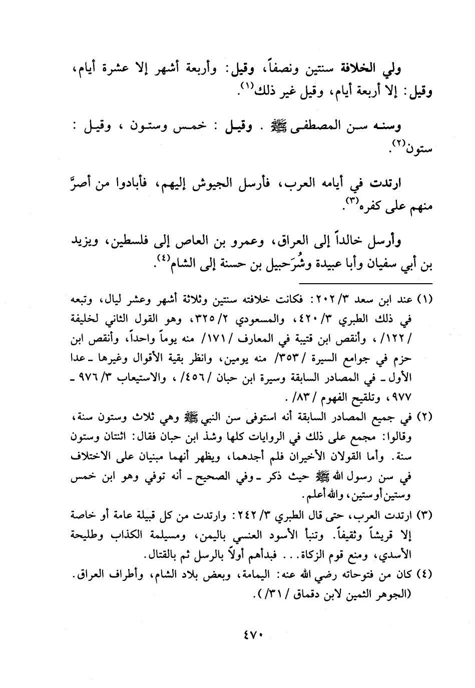 (¬1) عند ابن سعد 3/ 202: فكانت خلافته سنتين وثلاثة أشهر وعشر ليال، وتبعه في ذلك الطبري 3/ 420، والمسعودي 2/ 325، وهو القول الثاني لخليفة /122/، وأنقص ابن قتيبة في المعارف/171/منه يوما واحدا، وأنقص ابن حزم في جوامع السيرة/353/منه يومين، وانظر بقية الأقوال وغيرها-عدا الأول-في المصادر السابقة وسيرة ابن حبان/456/، والاستيعاب 3/ 976 - 977، وتلقيح الفهوم/83/.