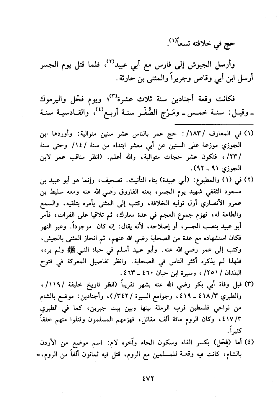 فكانت وقعة أجنادين سنة ثلاث عشرة (¬3)؛ ويوم فحل واليرموك -وقيل: سنة خمس-ومرج الصّفّر سنة أربع (¬4)، والقادسية سنة