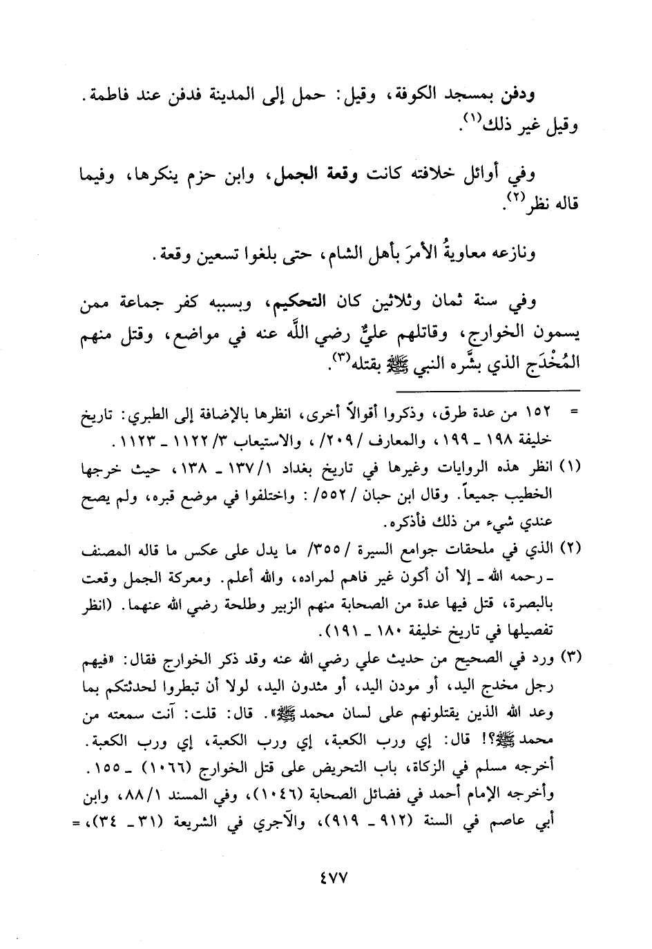 (¬2) الذي في ملحقات جوامع السيرة/355/ما يدل على عكس ما قاله المصنف -رحمه الله-إلا أن أكون غير فاهم لمراده، والله أعلم. ومعركة الجمل وقعت بالبصرة، قتل فيها عدة من الصحابة منهم الزبير وطلحة رضي الله عنهما. (انظر تفصيلها في تاريخ خليفة 180 - 191).