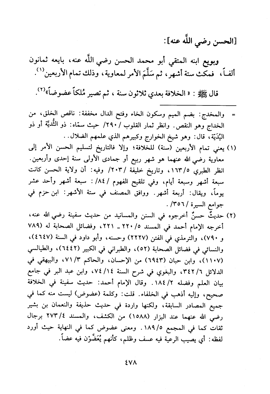 (¬2) حديث حسن أخرجوه في السنن والمسانيد من حديث سفينة رضي الله عنه، أخرجه الإمام أحمد في المسند 5/ 220 - 221، وفضائل الصحابة له (789 و 790)، والترمذي في الفتن (2227) وحسنه، وأبو داود في السنة (4647)، والنسائي في فضائل الصحابة (52)، والطبراني في الكبير (6442)، والطيالسي (1107)، وابن حبان (6943) من الإحسان، والحاكم 3/ 71، والبيهقي في الدلائل 6/ 342، والبغوي في شرح السنة 14/ 74، وابن عبد البر في جامع بيان العلم وفضله 2/ 184. وقال الإمام أحمد: حديث سفينة في الخلافة صحيح، وإليه أذهب في الخلفاء. قلت: وكلمة (عضوض) ليست منه كما في جميع المصادر السابقة، ولكنها واردة في حديث حذيفة والنعمان بن بشير رضي الله عنهما عند البزار (1588) من الكشف، والمسند 4/ 273 برجال ثقات كما في المجمع 5/ 189. ومعنى عضوض كما في النهاية حيث أورد لفظه: أي يصيب الرعية فيه عسف وظلم، كأنهم يعضّون فيه عضا.