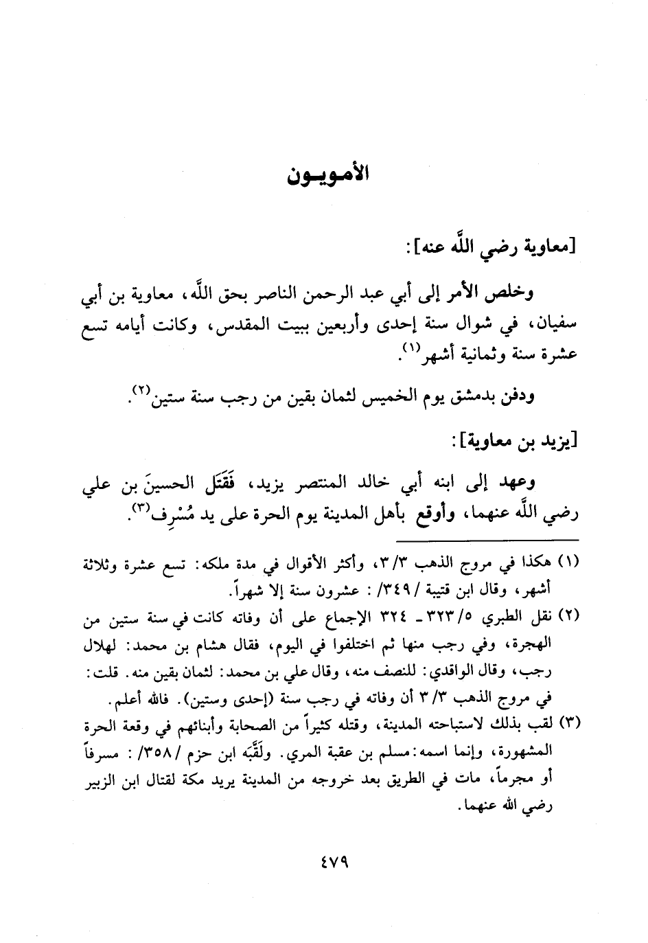 (¬2) نقل الطبري 5/ 323 - 324 الإجماع على أن وفاته كانت في سنة ستين من الهجرة، وفي رجب منها ثم اختلفوا في اليوم، فقال هشام بن محمد: لهلال رجب، وقال الواقدي: للنصف منه، وقال علي بن محمد: لثمان بقين منه. قلت: في مروج الذهب 3/ 3 أن وفاته في رجب سنة (إحدى وستين). فالله أعلم.