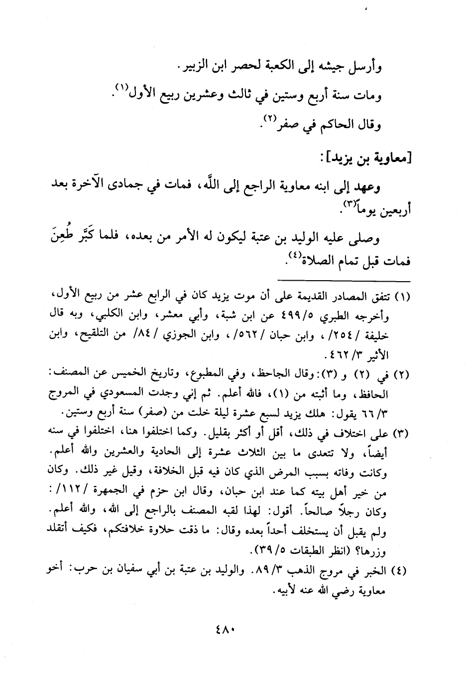(¬1) تتفق المصادر القديمة على أن موت يزيد كان في الرابع عشر من ربيع الأول، وأخرجه الطبري 5/ 499 عن ابن شبة، وأبي معشر، وابن الكلبي، وبه قال خليفة/254/، وابن حبان/562/، وابن الجوزي/84/من التلقيح، وابن الأثير 3/ 462.
