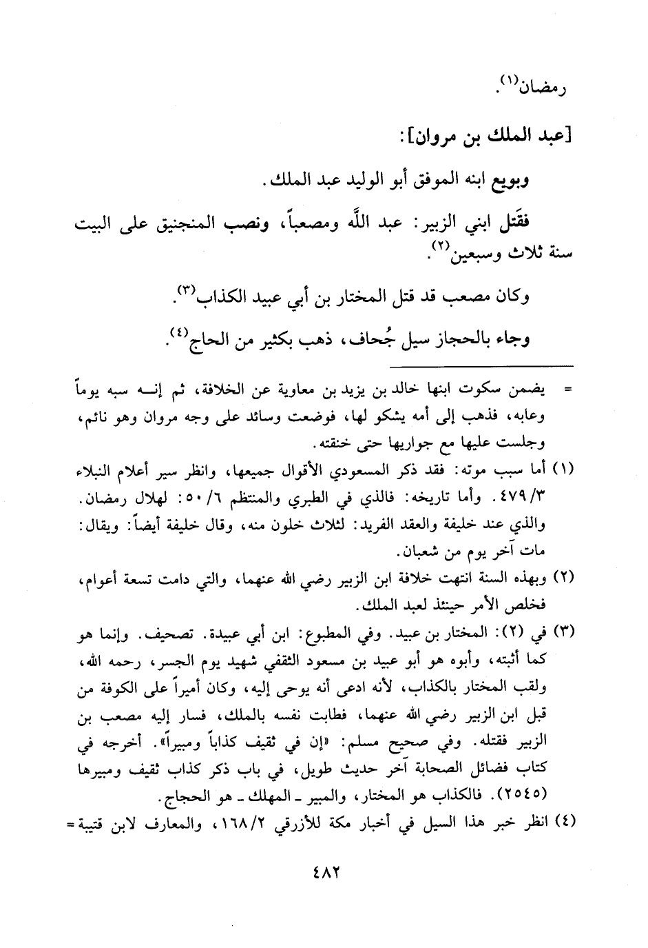 (¬1) أما سبب موته: فقد ذكر المسعودي الأقوال جميعها، وانظر سير أعلام النبلاء 3/ 479. وأما تاريخه: فالذي في الطبري والمنتظم 6/ 50: لهلال رمضان. والذي عند خليفة والعقد الفريد: لثلاث خلون منه، وقال خليفة أيضا: ويقال: مات آخر يوم من شعبان.