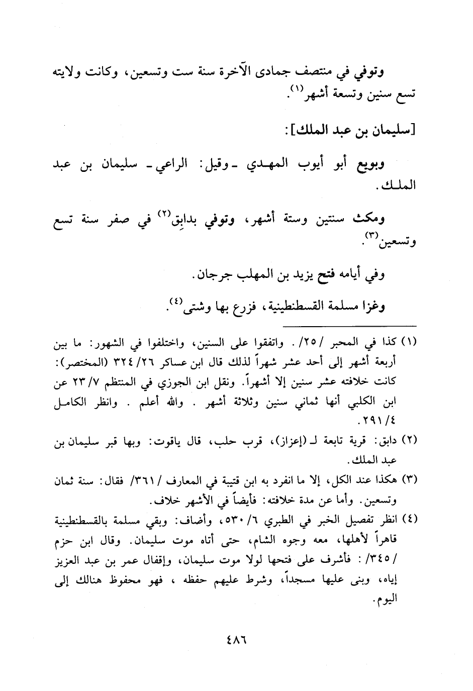 (¬4) انظر تفصيل الخبر في الطبري 6/ 530، وأضاف: وبقي مسلمة بالقسطنطينية قاهرا لأهلها، معه وجوه الشام، حتى أتاه موت سليمان. وقال ابن حزم /345/: فأشرف على فتحها لولا موت سليمان، وإقفال عمر بن عبد العزيز إياه، وبنى عليها مسجدا، وشرط عليهم حفظه، فهو محفوظ هنالك إلى اليوم.