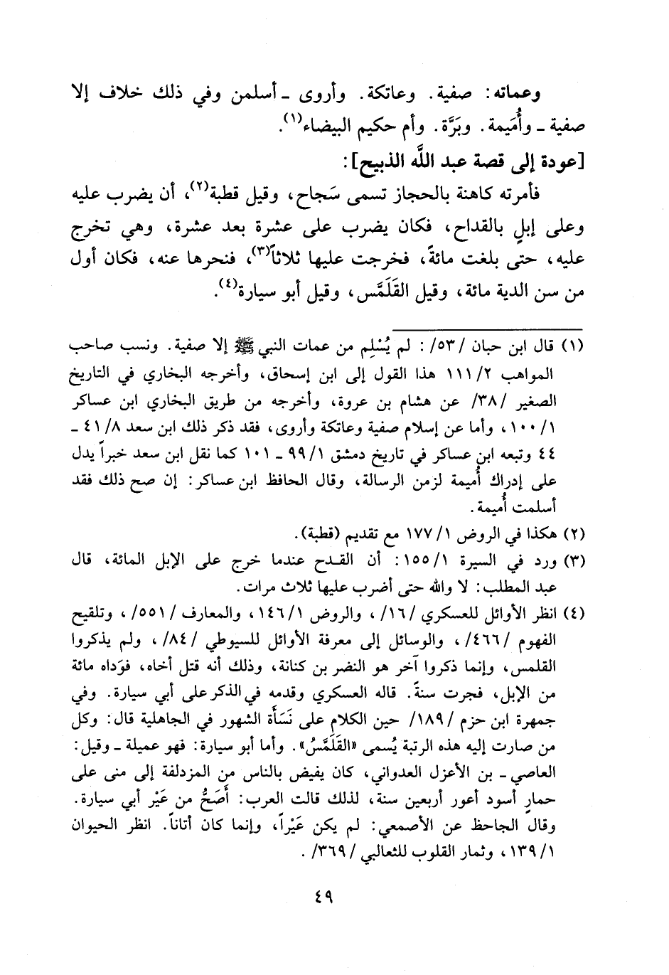 (¬1) قال ابن حبان/53/: لم يسلم من عمات النبي صلى الله عليه وسلم إلا صفية. ونسب صاحب المواهب 2/ 111 هذا القول إلى ابن إسحاق، وأخرجه البخاري في التاريخ الصغير/38/عن هشام بن عروة، وأخرجه من طريق البخاري ابن عساكر 1/ 100، وأما عن إسلام صفية وعاتكة وأروى، فقد ذكر ذلك ابن سعد 8/ 41 - 44 وتبعه ابن عساكر في تاريخ دمشق 1/ 99 - 101 كما نقل ابن سعد خبرا يدل على إدراك أميمة لزمن الرسالة، وقال الحافظ ابن عساكر: إن صح ذلك فقد أسلمت أميمة.