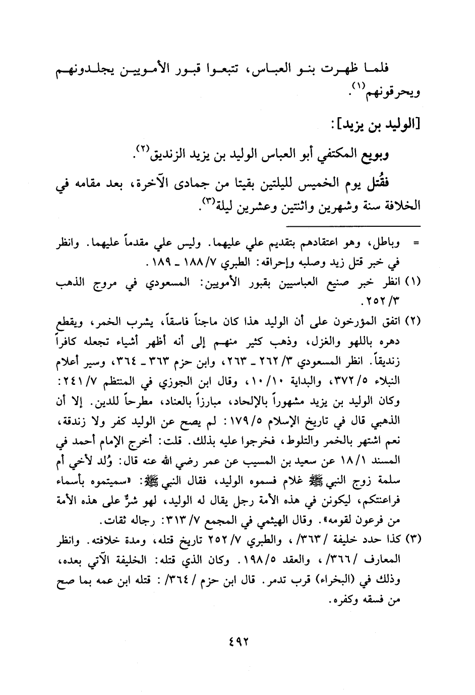 (¬2) اتفق المؤرخون على أن الوليد هذا كان ماجنا فاسقا، يشرب الخمر، ويقطع دهره باللهو والغزل، وذهب كثير منهم إلى أنه أظهر أشياء تجعله كافرا زنديقا. انظر المسعودي 3/ 262 - 263، وابن حزم 363 - 364، وسير أعلام النبلاء 5/ 372، والبداية 10/ 10، وقال ابن الجوزي في المنتظم 7/ 241: وكان الوليد بن يزيد مشهورا بالإلحاد، مبارزا بالعناد، مطرحا للدين. إلا أن الذهبي قال في تاريخ الإسلام 5/ 179: لم يصح عن الوليد كفر ولا زندقة، نعم اشتهر بالخمر والتلوط، فخرجوا عليه بذلك. قلت: أخرج الإمام أحمد في المسند 1/ 18 عن سعيد بن المسيب عن عمر رضي الله عنه قال: ولد لأخي أم سلمة زوج النبي صلى الله عليه وسلم غلام فسموه الوليد، فقال النبي صلى الله عليه وسلم: «سميتموه بأسماء فراعنتكم، ليكونن في هذه الأمة رجل يقال له الوليد، لهو شرّ على هذه الأمة من فرعون لقومه». وقال الهيثمي في المجمع 7/ 313: رجاله ثقات.